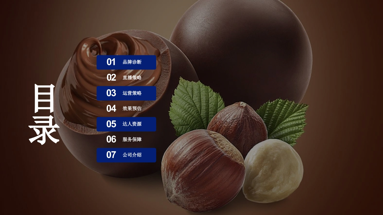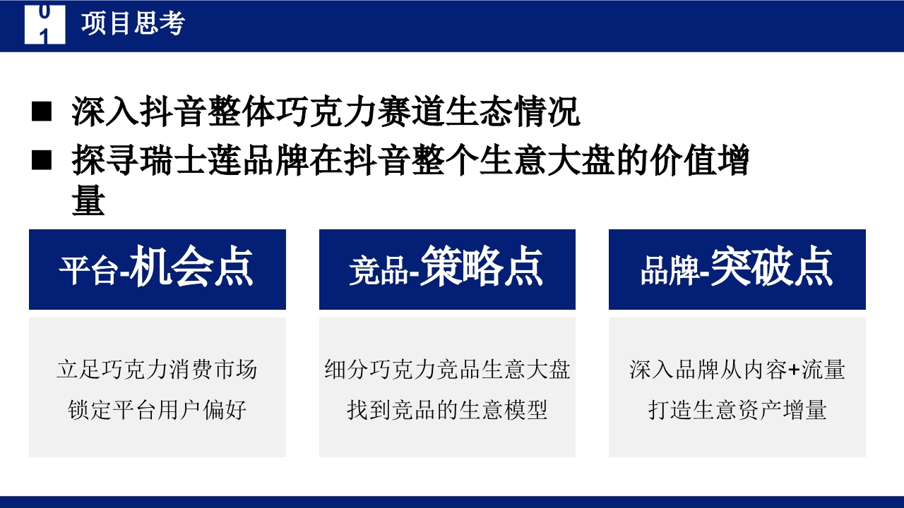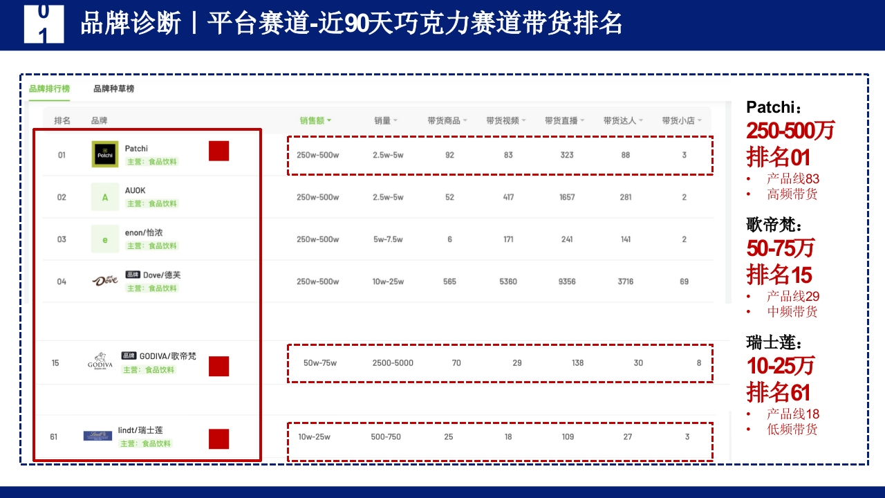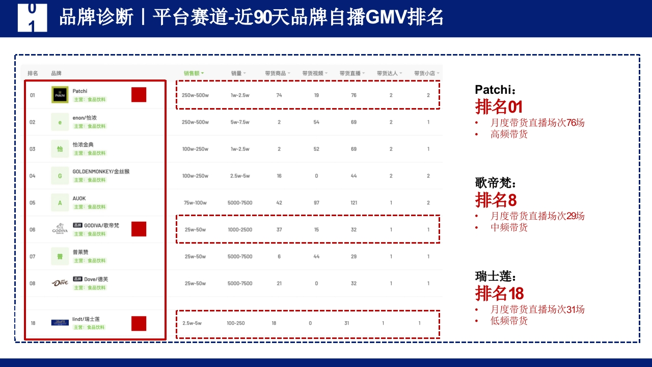 瑞士莲抖音直播代运营营销方搭建品牌内容阵地,聚焦内容+流量构建品牌生意增量LINDOR01品牌诊断02直播策略03运营策略景04效果预估05达人资源06服务保障07公司介绍01品牌诊断项目思考深入抖音整体巧克力赛道生态情况探寻瑞士莲品牌在抖音整个生意大盘的价值增量平台机会点竞品策略点品牌突破点立足巧克力消费市场细分巧克力竞品生意大盘深入品牌从内容+流量锁定平台用户偏好找到竞品的生意模型打造生意资产增量品牌诊断丨平台赛道-近90天巧克力赛道带货排名品牌排行榜品牌种草榜Patchi:排名品牌销售额销量带货商品带货视频带货直播,带货达人·带货小店250500万Patchi01250w-500w2.5w-5w928332388主营:食品饮料排名01·产品线83AUOK02250w-500w2.5w-5w主营:食品饮料624171657281高频带货03enon/怡浓歌帝梵:250w-500W5w-7.5w171241主营:食品饮料50-75万04Dote是阳Dove/德芙250w-500w10w-25w56553609356371669排名15主营:食品饮料产品线29中频带货瑞士莲:品闲G0DIVA/歌帝梵6GODIVA50w-75w2500-500030主营:食品饮料10-25万排名61产品线18lindt/瑞士莲低频带货6110w-25W500-75025109主营:食品饮料品牌诊断丨平台赛道-近90天品牌自播GMV排名排名品牌销售额,销量带货商品·带货视频、带货直播、带货达人·带货小店PatchiPatchi:250w-500w1w-2.5w7419主营:食品饮料排名018enon/怡浓250w-500w5w-7.5w主营:食品饮料·月度带货直播场次76场高频带货乐香怡浓金典100w-250w1w-2.5w主营:食品饮料GOLDENMONKEY/金丝猴100w-250w2.5w-5w主营:食品饮料歌帝梵:%AUOK75w-100w5000-750042主营:食品饮料排名8月度带货直播场次29场司G0DIVA/歌帝梵25w-50w1000-2500中频带货主营:食品饮料普莱赞25w-50w5000-7500主营:食品饮料Diie品调Dove/德芙瑞士莲:25w-50w5000-7500主营:食品饮料排名18月度带货直播场次31场indt/瑞士莲2.5w-5W100-250低频带货主营:食品饮料
