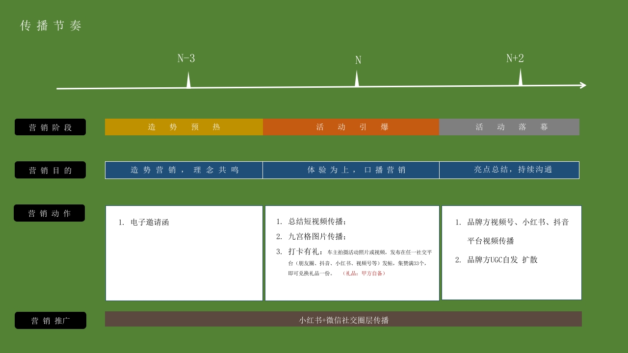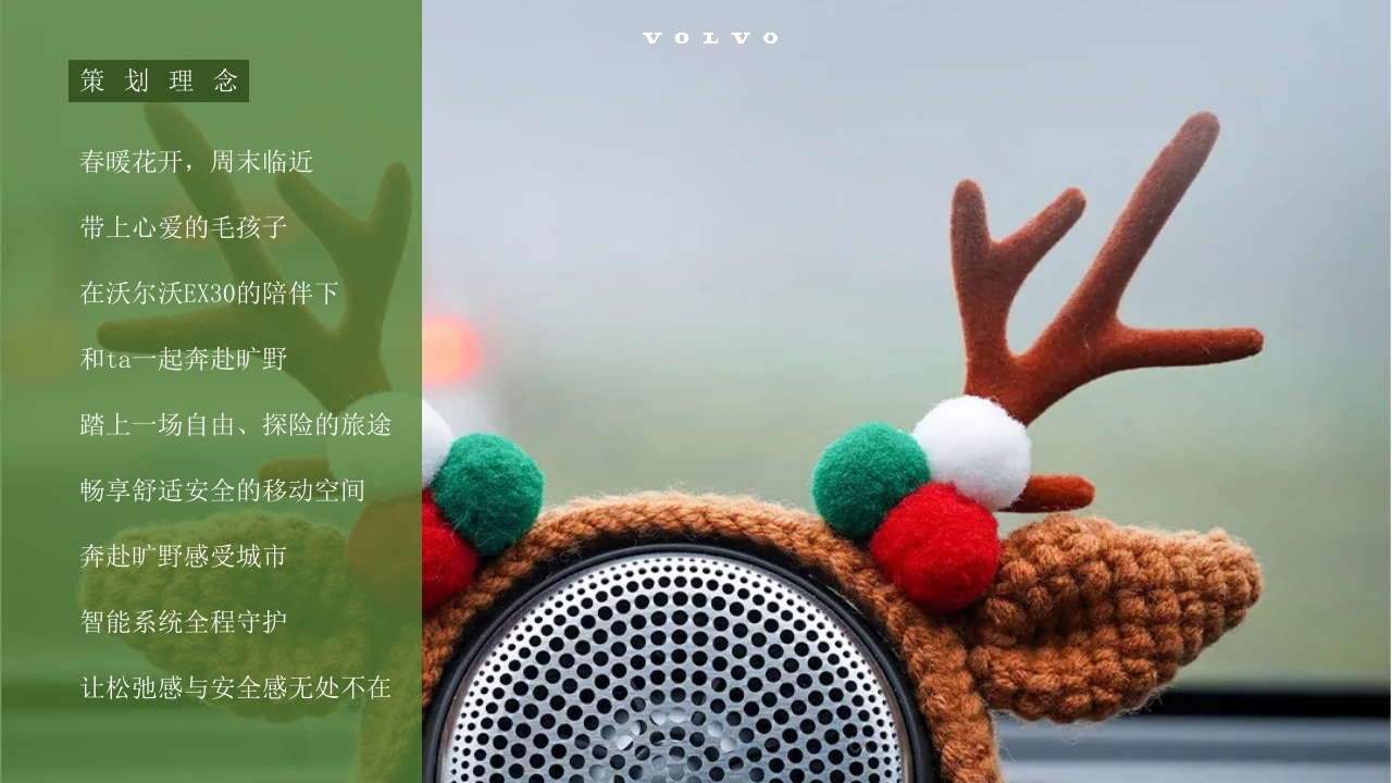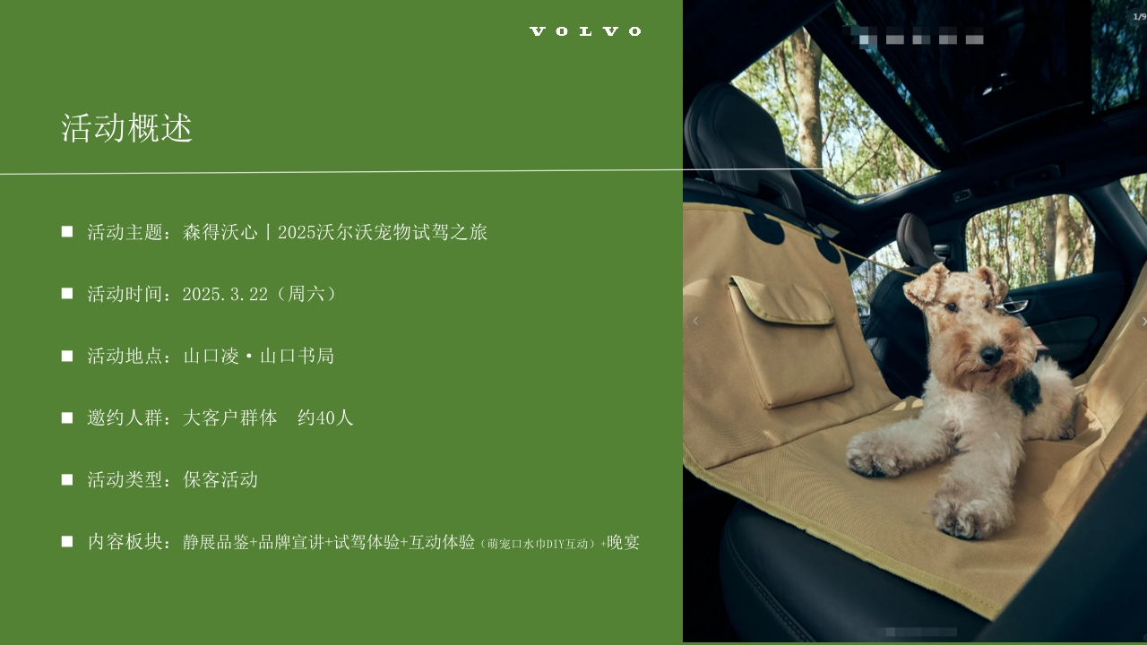 工沃家毛孩子们2025沃尔沃森系自驾之旅V O L V OCONTENTS01活动导入02执行规戰划03项目管控V O L V O背景&目的■结合春季、萌宠、自驾出游、体验等季节性热点,以森得「沃」心为主题,围绕高端用车生活方式,打造沃尔沃车主试驾活动,回馈忠实用户,提高新老用户对品牌的向心力,并利用主题活动扩大传播声量,吸引车主自发传播,助力沃尔沃汽车口碑营销,加深品牌认知,提升销量;VOLV O策划理念春暖花开,周末临近带上心爱的毛孩子在沃尔沃EX30的陪伴下和ta一起奔赴旷野踏上一场自由、探险的旅途畅享舒适安全的移动空间奔赴旷野感受城市智能系统全程守护让松弛感与安全感无处不在V O L V O活动概述■活动主题:森得沃心|2025沃尔沃宠物试驾之旅■活动时间:2025.3.22(周六)■活动地点:山口凌·山口书局■邀约人群:大客户群体约40人■活动类型:保客活动■内容板块:静展品鉴+品牌宣讲+试驾体验+互动体验(萌宠口水IY互动)+晚宴传播节奏N-3NN+2营销阶段造势预热活动引爆活动落幕营销目的造势营销,理念共鸣体验为上,口播营销亮点总结,持续沟通营销动作1.电子邀请函1.总结短视频传播:1.品牌方视频号、小红书、抖音2.九宫格图片传播:平台视频传播3.打卡有礼:车主拍摄活动照片或视频,发布在任一社交平台(朋友图、抖音、小红书、视频号等)发帖,集赞满33个,2.品牌方UGC自发扩散即可兑换礼品一份。(礼品:甲方自备)营销推广小红书+微信社交圈层传播