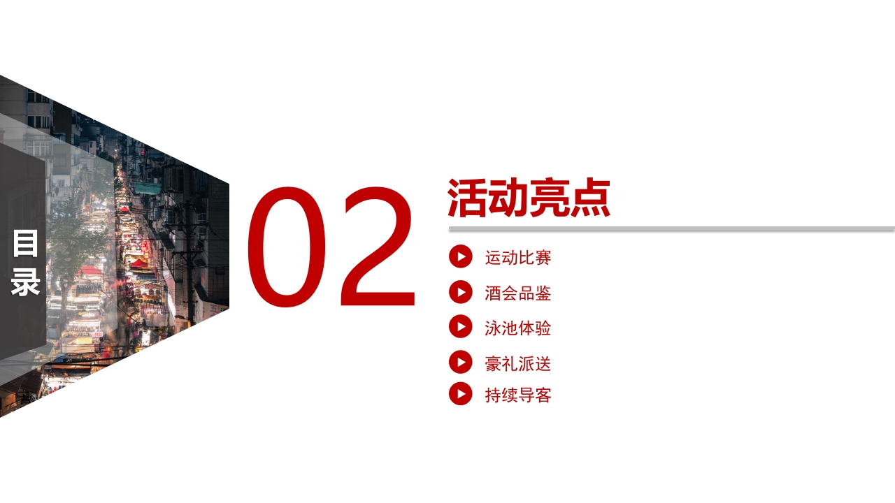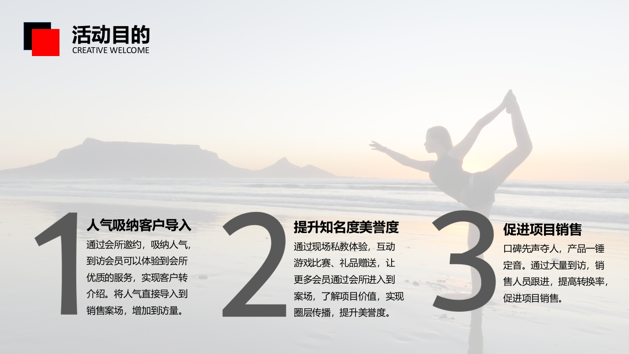图本·并可房岗无运动不青春N o M O V E M EN TNOY O U T H腾飞洪河富贵健身会所开放仪式2023.622目录CREATIVE WELCOME面小·可01活动概况02活动亮点03活动内容04其他规划05公司简介活动目的CREATIVE WELCOME人气吸纳客户导入2提升知名度美誉度3促进项目销售通过会所邀约,吸纳人气,通过现场私教体验,互动口碑先声夺人,产品一锤到访会员可以体验到会所游戏比赛、礼品赠送,让定音。通过大量到访,销优质的服务,实现客户转更多会员通过会所进入到售人员跟进,提高转换率介绍。将人气直接导入到案场,了解项目价值,实现促进项目销售。销售案场,增加到访量。圈层传播,提升美誉度。活动概况CREATIVE WELCOME23活动主题活动时间活动人数“无运动不青春”2023年7月23日200人以上腾飞洪河富贵健身会所开放仪式5活动内容活动地点活动调性开业仪式+现场布置+互动体验许昌腾飞洪河富贵健身会所体验/互动/私享/高端活动亮点目录02运动比赛酒会品鉴泳池体验⊙豪礼派送持续导客如何打造一场独一无二的高端调性/舒适体验的开业仪式?