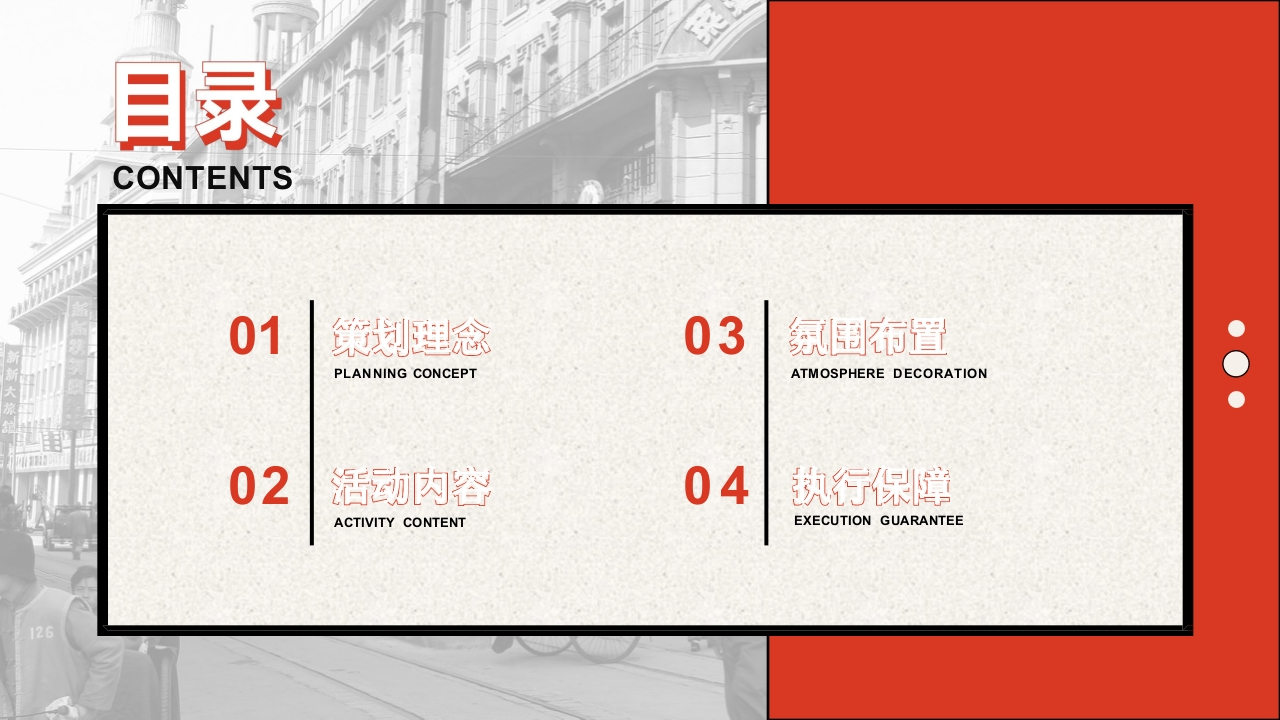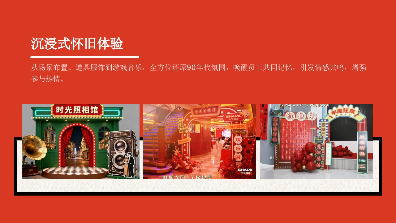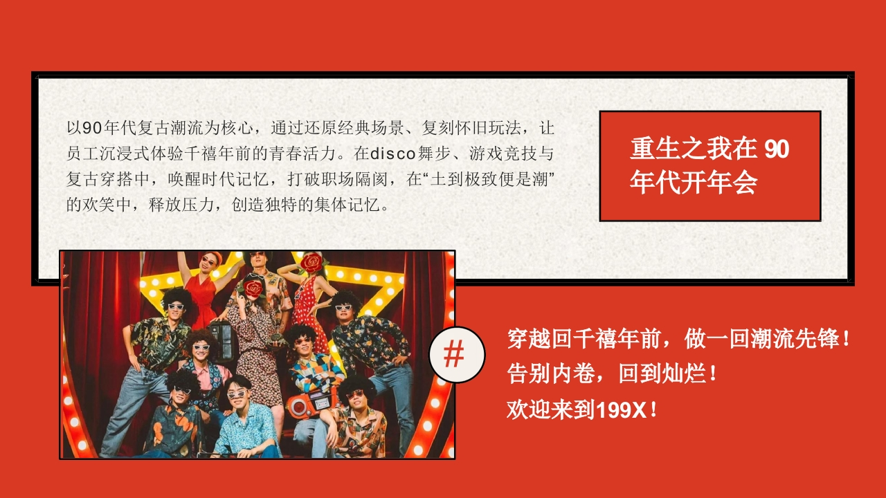 重生之我在90年代开年会穿越回千禧年前,做一回潮流先锋!2026年年会策划方案目尿CONTENTS01策划理念03氛布置PLANNING CONCEPTATMOSPHERE DECORATION02活肉容04执行保蟑ACTIVITY CONTENTEXECUTION GUARANTEE12601020304PART ONE策划理宠入昌PLANNING CONCEPTPART ONE●O●以90年代复古潮流为核心,通过还原经典场景、复刻怀旧玩法,让员工沉浸式体验千禧年前的青春活力。在dⅰsco舞步、游戏竞技与重生之我在90复古穿搭中,唤醒时代记忆,打破职场隔阂,在“土到极致便是潮”年代开年会的欢笑中,释放压力,创造独特的集体记忆。井穿越回千禧年前,做一回潮流先锋!告别内卷,回到灿烂!欢迎来到199X!沉浸式怀旧体验从场景布置、道具服饰到游戏音乐,全方位还原90年代氛围,唤醒员工共同记忆,引发情感共鸣,增强参与热情。时光照相馆度狂欢掉上酒时H业)2川全员互动性强游戏机争霸、迪斯科教学、穿搭大赛等环节覆盖不同兴趣的员工,避免“只有少数人参与”的尴尬,让每位员工都能参与其中,展现自我。)复破:青着怡时来牛自罗月启-②O②④徐里都比空因