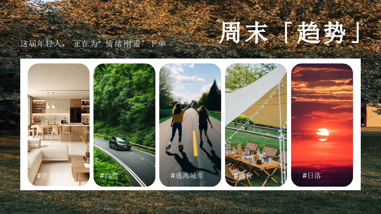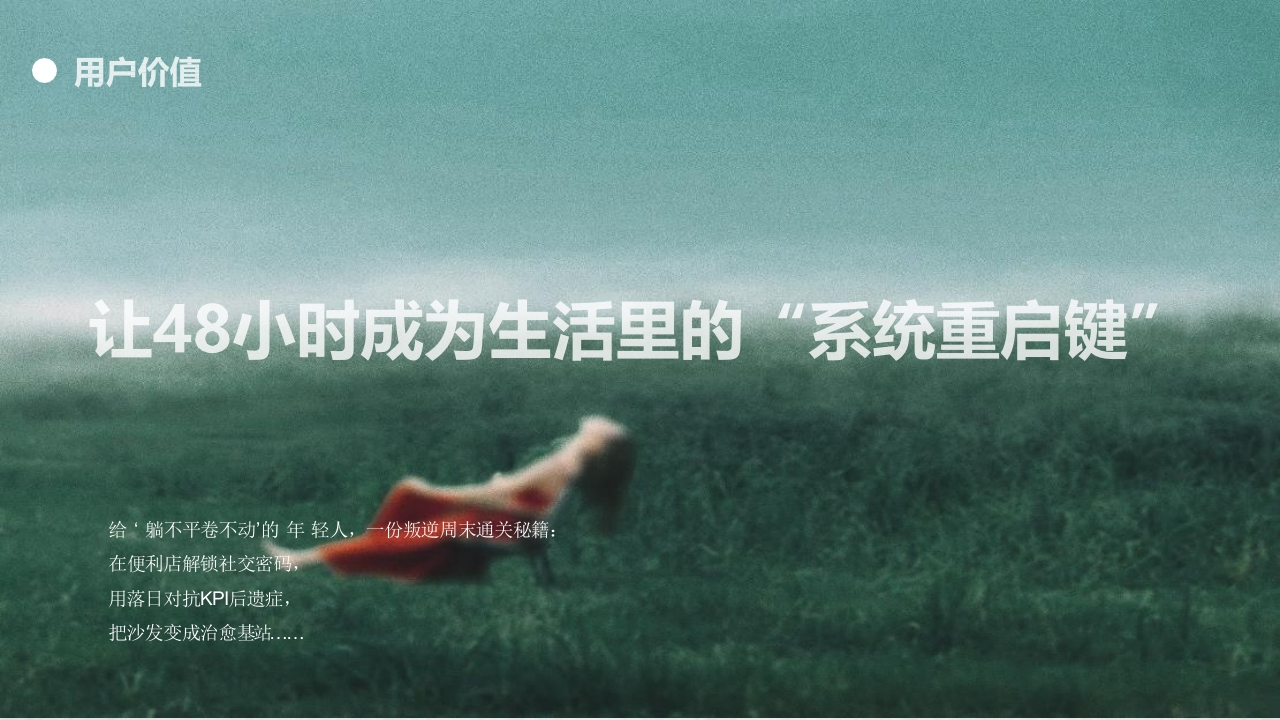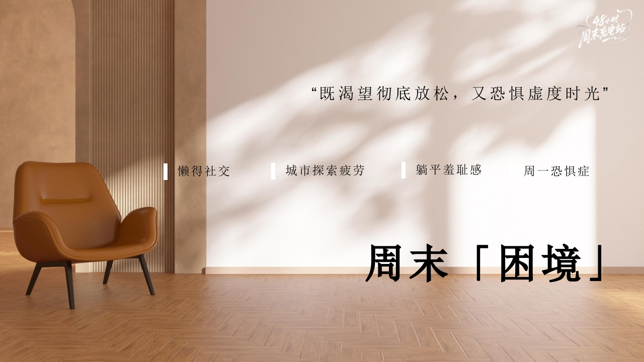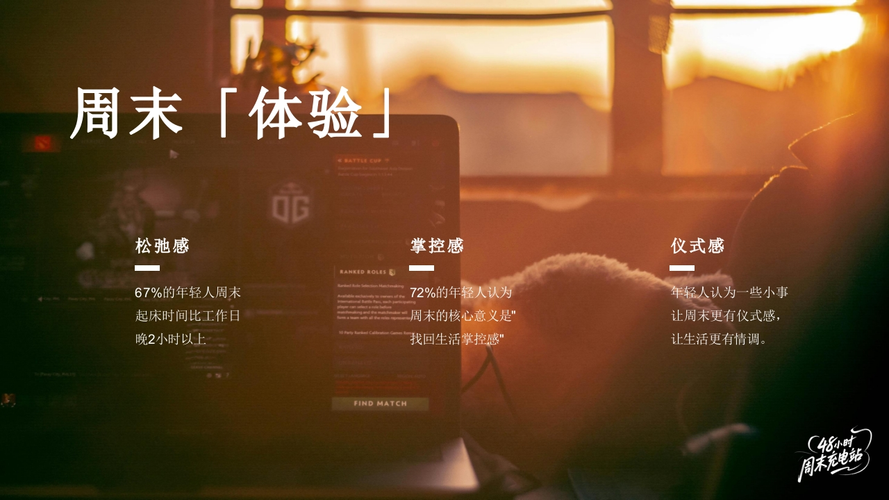 weekend48小时周末充电站巨量引擎行业招商IP(时阁花电能“既渴望彻底放松,又恐惧虚度时光”懒得社交城市探索疲劳躺平羞耻感周一恐惧症周末「困境」周末「趋势」这届年轻人,正在为“家情绪刚需”下单#在家休息#自驾#逃离城市露营#日落周末「体验」K BATTLE CUP松弛感掌控感仪式感信ANKED ROLE5一67%的年轻人周末72%的年轻人认为年轻人认为一些小事起床时间比工作日周末的核心意义是”让周末更有仪式感,晚2小时以上找回生活掌控感”让生活更有情调。FIND MATCHC48时电量告急,需要充电●用户价值让48小时成为生活里的“系统重启键给‘躺不平卷不动'的年轻人,一份叛逆周末通关秘籍:在便利店解锁社交密码,用落日对抗KP后遗症,把沙发变成治愈基站..