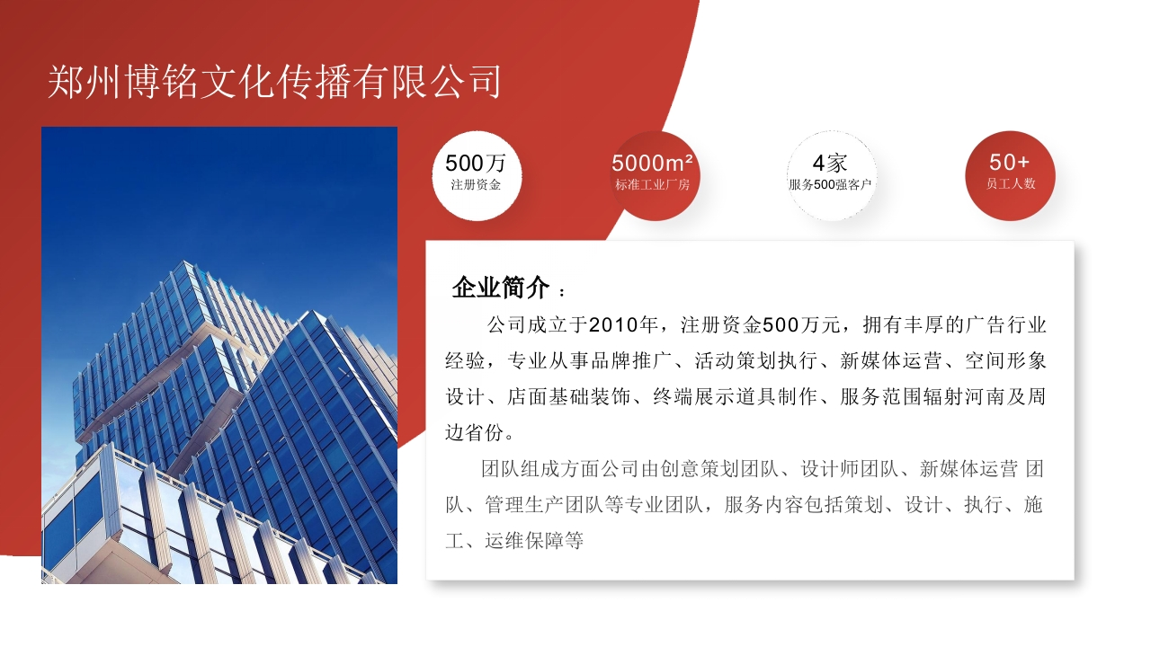 2025首届全国沐m中原高峰论坛暨首届中原地区酒店沐浴用品采购峰会新商机、新资源、新模式,共筑新未来中国沐浴行业协会全国沐浴河南俱乐部郑州博铭文化传播有限公司500万5000m24家50+注册资金标准工业厂房服务500强客户员工人数企业简介公司成立于2010年,注册资金500万元,拥有丰厚的广告行业经验,专业从事品牌推广、活动策划执行、新媒体运营、空间形象设计、店面基础装饰、终端展示道具制作、服务范围辐射河南及周边省份。团队组成方面公司由创意策划团队、设计师团队、新媒体运营团队、管理生产团队等专业团队,服务内容包括策划、设计、执行、施工、运维保障等相关案例e..intelLenovo联想《联想中东大区新财年启动大会》FY2023/24联想中国万众一心攻艰克难来自中东大区4省(山东、河南、湖南、湖北)..共赢新时的合作伙伴500余人;活动采用主会场+分会大区一心一起拼场模式,AI主题元素贯穿全会,全程现场直播画质高清稳定,得到联想总部领导的高度好评会工intel.Lenovo型关燕新时代intelLenovo联想intelLenovo联想intel古比过5intel+Lenovo哔≤n麻会线工芒关高新时代相关案例a set-up withglobal availability《2024中国国际涂料大会》8@6@全球网络,本地管理主办单位龙佰集团股份有限公司来自国家部委、地方政府领导、专家学者、涂料上下游产业链企业约1530名代表参加主协办单位Produ汽涂多多电子商务股份有了本次大会:江长安仁恒科技股份有活动邀请到现任郑州市市长何雄、郑州市工#1500n nur产品市场信局局长、巩义市市长等政府领导参会并发协办单位0四巴健富体表重要讲话。·新江丰虹新olier for performance addit网雅阳圣恒环specialty resins河南金锁科性能添加剂和特种树脂供4%公司2024中国国际涂料影4中■国际涂料大舍2024中国国际涂料大會金料大24中回国际涂料大金2024中国国际涂料大会相关案例《新星科技新品发布会》本次大会共邀约全国1000余名客户代表参加,全程现场直播,并在场地布置、环节设C》6s计等方面融入众多科技感十足的服务设备,;全会活动所有可得充分好评DIGITIZE&FUTURE数智新生质额赤来G的6w-5n4《3三十而你好earsE&FUTUREZE&FUTURE质颜赤来新生质颜赤来PA会议规划01Mee t i n g P l a nn i n g