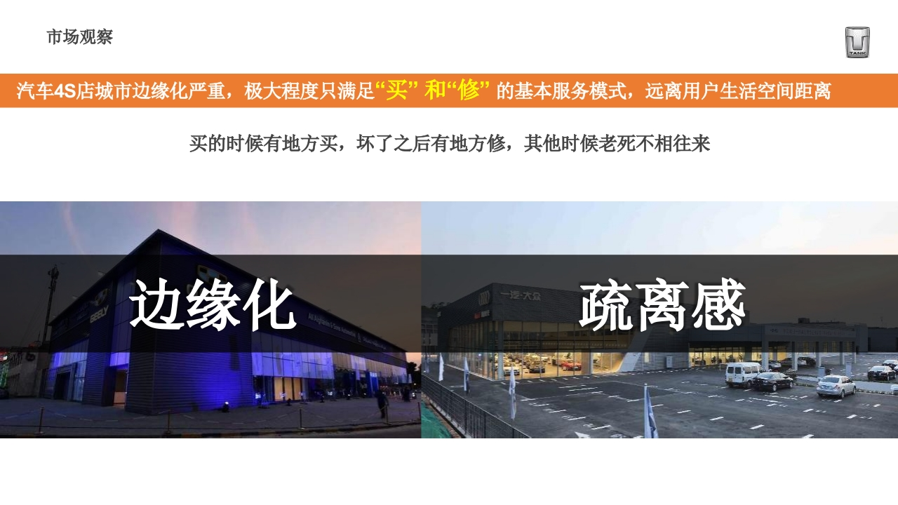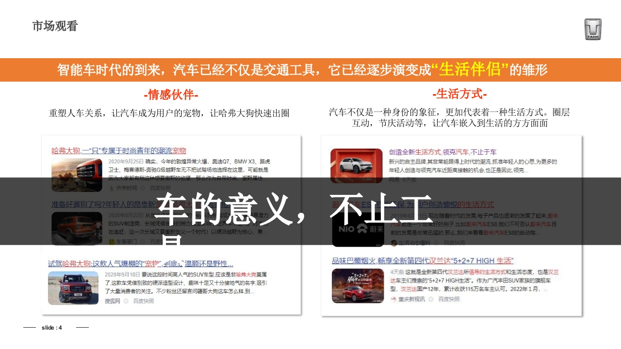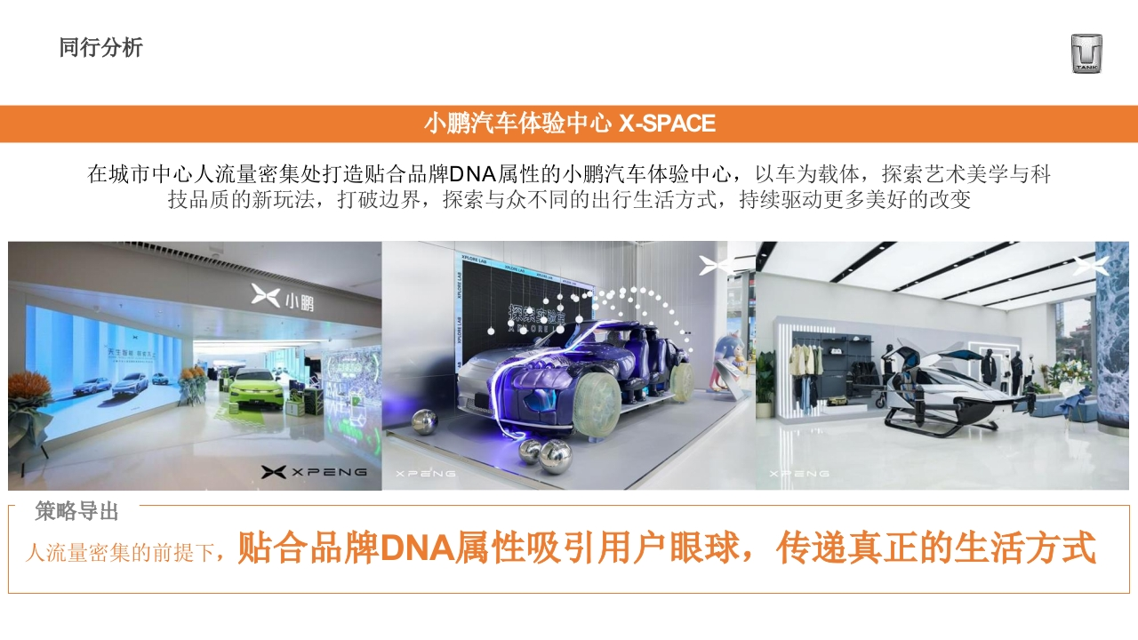 TANK山E旦克B心N课题一坦克直营店高端化运营坦克500展台升级运营升级圆TANK体验中心TANK回PART1市场分析HOW ABOUT THE MARKET?市场观察汽车4S店城市边缘化严重,极大程度只满足“买”和“修”的基本服务模式,远离用户生活空间距离买的时候有地方买,坏了之后有地方修,其他时候老死不相往来边缘化大疏离感市场观看智能车时代的到来,汽车已经不仅是交通工具,它已经逐步演变成“生活伴侣”的雏形情感伙伴。生活方式重塑人车关系,让汽车成为用户的宠物,让哈弗大狗快速出圈汽车不仅是一种身份的象征,更加代表着一种生活方式。圈层互动,节庆活动等,让汽车嵌入到生活的方方面面哈弗大狗,一“只“专属于时尚青年的潮流宠物创造全新生活方式领克汽车不止于车2020年9月25日确实,今年的敦煌异常火爆,奥迪Q7、BMWX3、路虎新兴的白主品牌其非常能跟得上时代的潮流抓准年轻人的心思,为更多的卫士、梅赛德斯奔驰G级越野车无不把试驾场地选择在这里,可能就是年轻人创造与领克汽车近距离接触的机会也正是因此领克.齐宇时间准备好遛狗了吗?年轻人的晶车的意义,不止工造愉悦的生活方试2020年8月22日在随着时代的发展电子产品也逐斯的发展了起来:端的SUV制造商,长城的例子比如蔚来汽车E$8,我们不可否认感来汽车目在造赶,这一次长城汉里新个时代!以派越野为核心,前的发展是非常迅经的那么,我们来看看筒来汽车ES8的自动驾角生活动态据料试驾哈弗大狗:这款人气爆棚的宠物”,底温顺还是野性品味巴蜀烟火畅享全新第四代汉兰达“5+2+7HIGH生活2020年9月18日要说这段时问高人气的SUV车型,应该是非哈弗大狗莫属4天前这就是全新第四代汉兰达所相导的生活方式和生活态度,也是汉兰了这款车凭借别致的硬派话型设计、趣味十足又十分接地气的名字,吸引达车主们性装的5+2+7HIGH性活。作为广汽丰田SUV家的旗舰车了大量消费者的关注。不少粉丝还留言问睡哥大狗这车怎么样到】型.汉兰达国产12年,累计收获115万名车主认可.2022年1月.搜犯网。百度快照。里庆新视讯。百度快slide 4市场观看回因此,新形态门店运营方式应运而生城市中心商超门店如何中心化?走进客群,如何拉近空间距离,产生更高频互动同行分析小鹏汽车体验中心X-SPACE在城市中心人流量密集处打造贴合品牌DNA属性的小鹏汽车体验中心,以车为载体,探索艺术美学与科技品质的新玩法,打破边界,探索与众不同的出行生活方式,持续驱动更多美好的改变>火小鹏>《XP≡NGXPENG策略导出人流量密集的前提下,贴合品牌DNA属性吸引用户眼球,传递真正的生活方式
