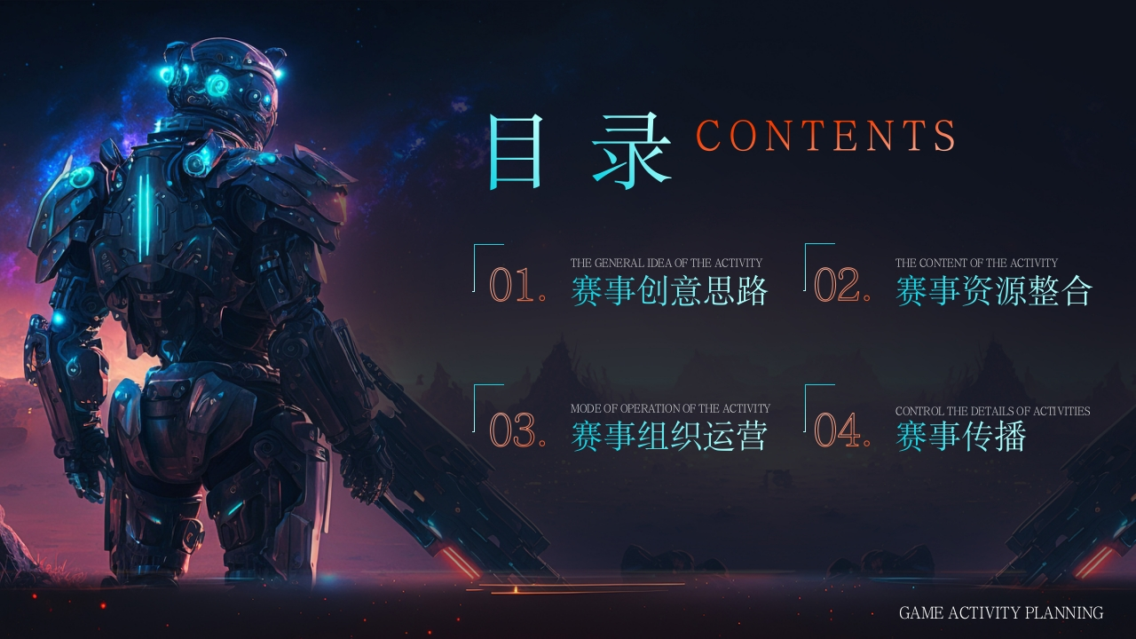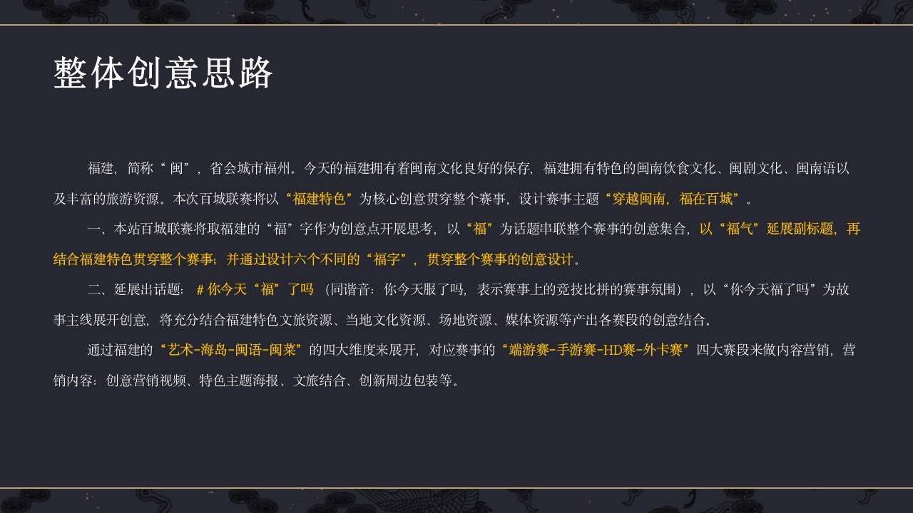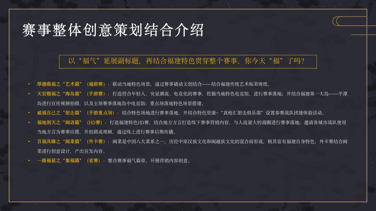 E-SPORTS GAMES电子竞技游戏EVENT PLANNING FOR E-SPORTS GAMES赛事执行ESPORTSGAME ACTIVITY PLANNING目录CONTENTSTHE GENERAL IDEA OF THE ACTIVITYTHE CONTENT OF THE ACTIVITY01.赛事创意思路02.赛事资源整合MODE OF OPERATION OF THE ACTIVITYCONTROL THE DETAILS OF ACTIVITIES03.赛事组织运营O4。赛事传播GAME ACTIVITY PLANNING赛事整体创意与思路整体创意思路福建,简称“闽”,省会城市福州。今天的福建拥有着闽南文化良好的保存,福建拥有特色的闽南饮食文化、闽剧文化、闽南语以及丰富的旅游资源。本次百城联赛将以“福建特色”为核心创意贯穿整个赛事,设计赛事主题“穿越闽南,福在百城”。一、本站百城联赛将取福建的“福”字作为创意点开展思考,以“福”为话题串联整个赛事的创意集合,以“福气”延展副标题,再结合福建特色贯穿整个赛事;并通过设计六个不同的“福字”,贯穿整个赛事的创意设计。二、延展出话题:#你今天“福”了吗(同谐音:你今天服了吗,表示赛事上的竞技比拼的赛事氛围),以“你今天福了吗”为故事主线展开创意,将充分结合福建特色文旅资源、当地文化资源、场地资源、媒体资源等产出各赛段的创意结合。通过福建的“艺术-海岛-闽语-闽菜”的四大维度来展开,对应赛事的“端游赛-手游赛-D赛-外卡赛”四大赛段来做内容营销,营销内容:创意营销视频、特色主题海报、文旅结合、创新周边包装等赛事整体创意策划结合介绍以“福气”延展副标题,再结合福建特色贯穿整个赛事,你今天“福”了吗?厚德载福之“艺术篇”(端游赛):联动当地特色场景,通过赛事撬动文创结合一结合福建传统艺术柘荣剪纸.天官赐福之“海岛篇”(手游赛):打造符合年轻人、突显潮流、电竞化的赛事,挖掘当地特色电竞馆,进行赛事落地;并结合福建第一大岛一平潭岛进行宣传视频拍摄,以及主场赛事落地岛中电竞馆;重点场落地特色场景搭建威福自己之“射击篇”(手游重点场):结合特色场地进行赛事落地,并结合特色资源-“真枪汇射击俱乐部”设置参赛战队团建体验活动福地洞天之“闽语篇”(HD赛):打造福建特色HD赛,结合地方方言打造线下赛事营销内容,与人流量大的商圈进行赛事落地;邀请各城市战队使用当地方言为赛事应援,并拍摄成视频,通过线上进行赛事后期传播百福具臻之“闽菜篇”(外卡赛):闽菜是中国八大菜系之一,历经中原汉族文化和闽越族文化的混合而形成,极其富有福建自身特色,外卡赛结合闽菜进行创意设计,产出宣发内容一路福星之“集福篇”(省赛):整合赛事福气篇章,开展营销内容创意。色资源与赛事创意结合