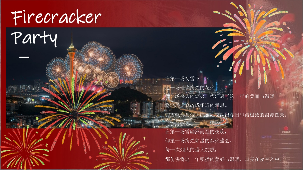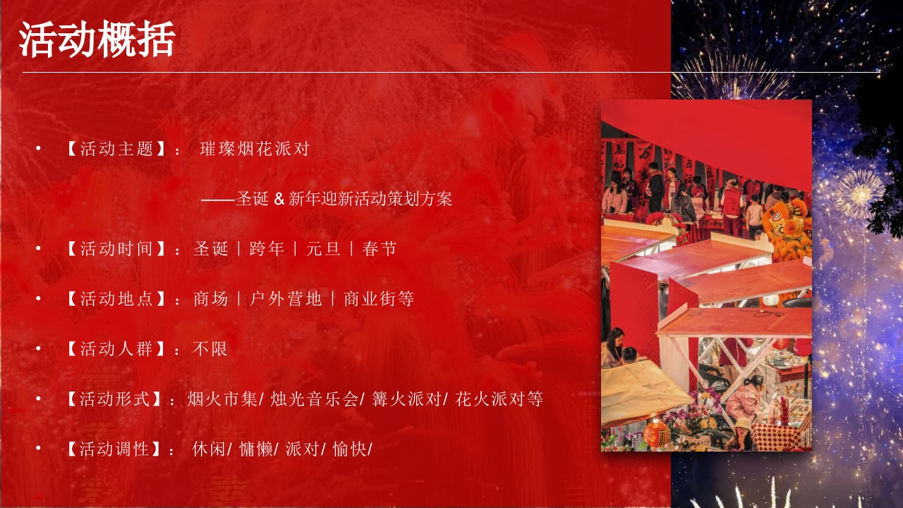 双旦底对025圣诞&新年迎新活动策划方案FirecrackerParty在第一场初雪下场璀璨绚烂的花火场盛大的烟灭,都汇聚了这一年的美丽与温暖将这段话修改成相近的意思。初雪飘落与烟灭绽漱、交织出冬日里最极致的浪漫图景在第一场雪翩然而至的夜晚,仰望一场绚烂如星的烟火盛会。每一次烟火的盛大绽放,都仿佛将这一年积攒的美好与温暖,点亮在夜空之中。Firecrackerparty灿若星河,温暖如初。我们以一场花火,融合艺术与市集,联结圣诞的静谧与新年的狂欢。这里有无尽夜空盛焰,也有非遗匠心大赏。此间璀N、璨,敬献于你,共度场热烈绚烂的双旦佳节。双旦025香动彩圣诞&新年迎新活动策划方案活动概括【活动主题】:璀璨烟花派对圣诞&新年迎新活动策划方案【活动时间】:圣诞丨跨年元旦」春节【活动地点】:商场丨户外营地丨商业街等【活动人群】:不限【活动形式】:烟火市集/烛光音乐会/篝火派对/花火派对等【活动调性】:休闲/慵懒/派对/愉快/活动目的在岁末的浪漫氛围中,迎接场冬日的奇迹。双旦佳节,以一场热烈的烟花派对拉开序幕:贯穿档期的烟花艺术节与烟火市集、圣诞夜的烛光音乐会与点燃仪式、跨年夜的围炉篝火与压轴盛焰我们倾力打造这场辞旧迎新的盛大浪漫,为您点燃永不落幕的璀璨记忆。