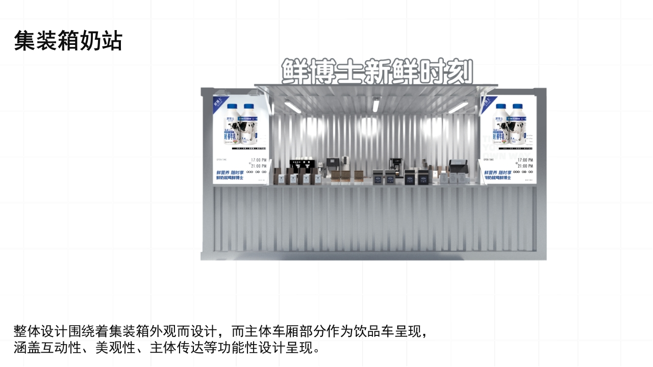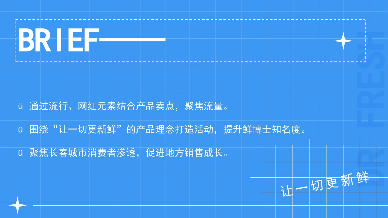 XX出品鲜博士新鲜时刻鲜博士新鲜时刻鲜博士新鲜时刻鲜博士牛奶新鲜时刻FRESH TIME FOR FRESH DOCTOR线下场景设计活动方案OFFLI N ESCENEDESI GNACT I VI TY PLAN让一切更新鲜·BR IEF通过流行、网红元素结合产品卖点,聚焦流量。心围绕“让一切更新鲜”的产品理念打造活动,提升鲜博士知名度。聚焦长春城市消费者渗透,促进地方销售成长。让一切更新鲜鲜博士角色升级国民饮品→网红先锋传统家庭+个体消费线下散点→流量聚焦鲜博士MAKE IT FRESH让一切Dr.Fresh通过聚焦活动,生成品牌标签印象新鲜/潮流/打卡/火爆3.4白鲜营养随时享区别于其他品牌的标签,辅助受众了解产品3.4优乳蛋白鲜博集装箱与鲜博士的结合为受众带来鲜时光×鲜时刻带你感受新鲜散发的力量乘坐鲜时空车厢,穿越时光,找到“新鲜时刻”的答案鲜博士MAKE IT FRESH让一切Dr.Fresh3.4白鲜营养随时享3.4g7鲜博士受众群体画像个体消费用户品牌忠实用户亲子家庭用户集装箱奶站鲜博士新鲜时物1700U1700Pw21.00W鲜营界腾时享00鲜营养随时享0000鲜奶鲜博士整体设计围绕着集装箱外观而设计,而主体车厢部分作为饮品车呈现,涵盖互动性、美观性、主体传达等功能性设计呈现。