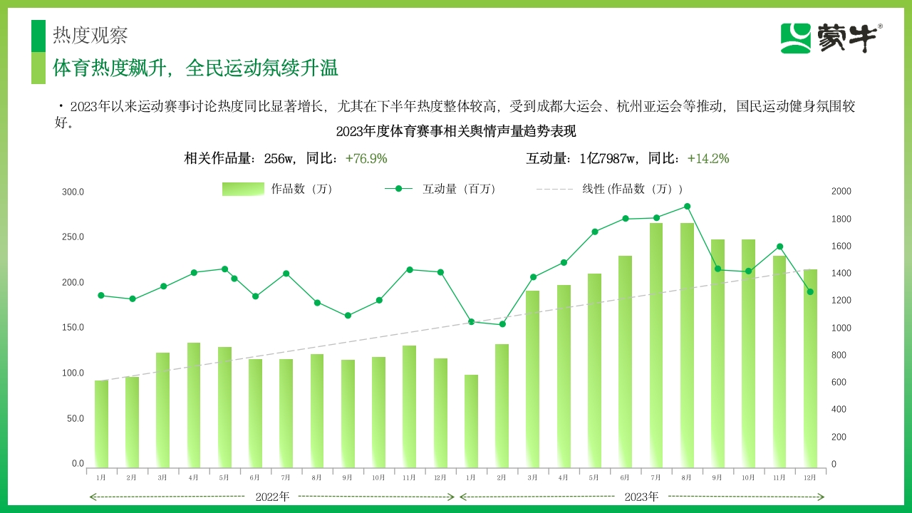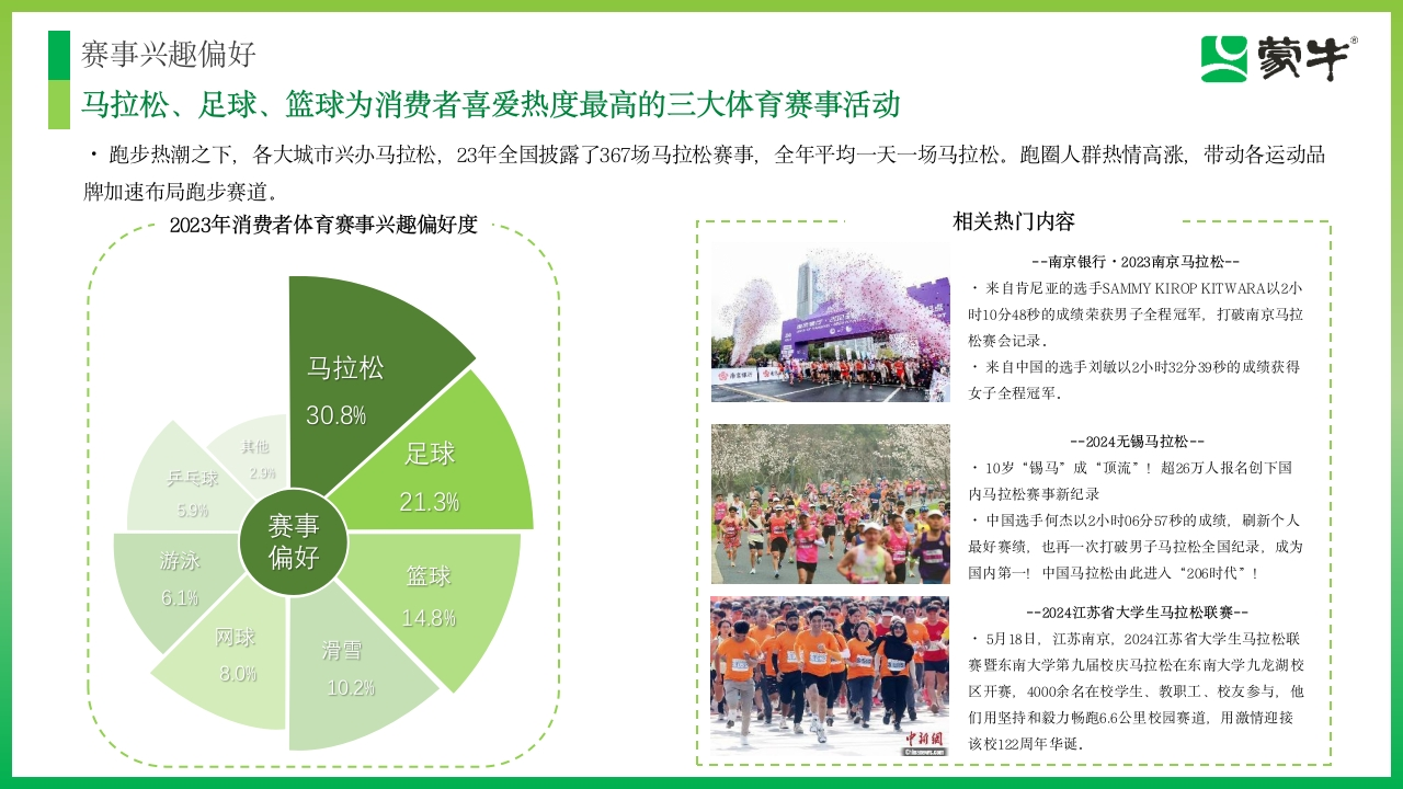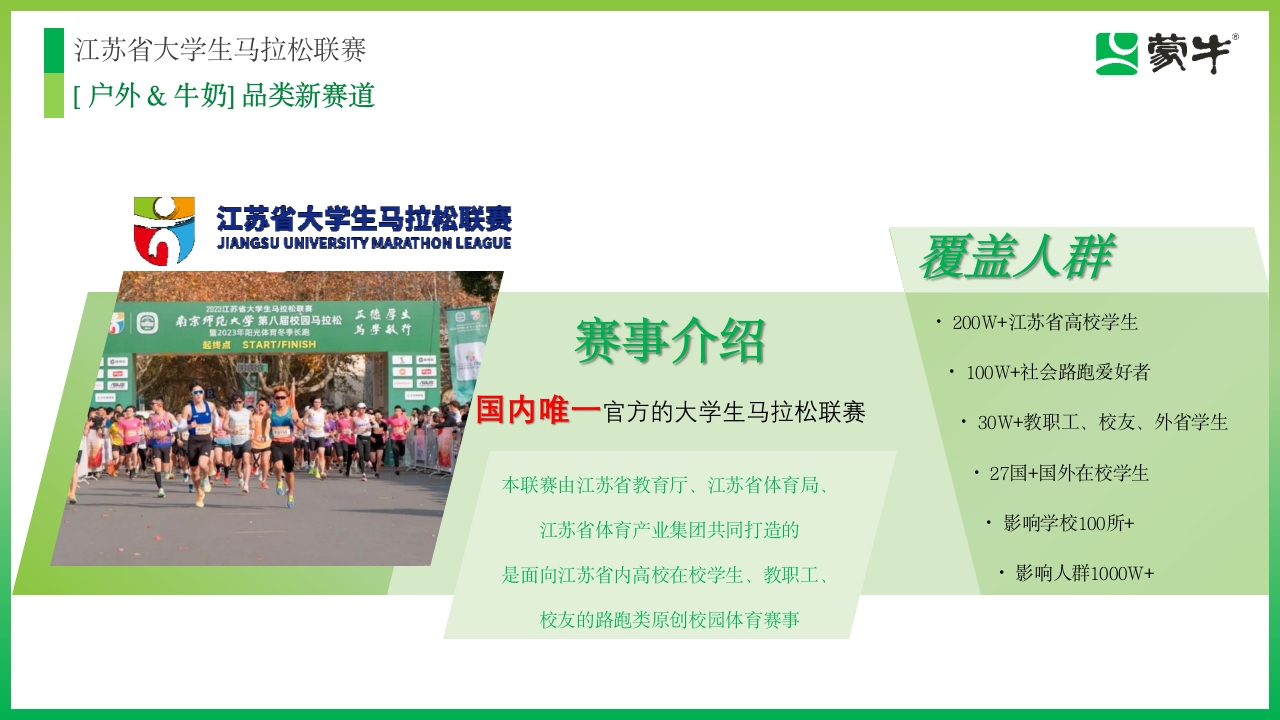 2024乳制品品牌大学生马拉松联赛活动策划方案PART.01主题策略马蒙牛纯甄Theme strategy乳0添加、0色末.0.0肚子舒服的牛奶经典原味净金:200800四配热度观察9蒙牛体育热度飙升,全民运动氛续升温2023年以来运动赛事讨论热度同比显著增长,尤其在下半年热度整体较高,受到成都大运会、杭州亚运会等推动,国民运动健身氛围较好.2023年度体育赛事相关舆情声量趋势表现相关作品量:256w,同比:+76.9%互动量:1亿7987w,同比:+14.2%300.0作品数(万)一一互动量(百万)线性(作品数(万))20001800250.016001400200.01200150.01000800100.060040050.02000.001月6月7月8月9月T10月1月T2月1月2明3月4月5月T7月T8月T9月T10月1月12月2022年----2023年--赛事兴趣偏好兴蒙牛马拉松、足球、篮球为消费者喜爱热度最高的三大体育赛事活动跑步热潮之下,各大城市兴办马拉松,23年全国披露了367场马拉松赛事,全年平均一天一场马拉松。跑圈人群热情高涨,带动各运动品牌加速布局跑步赛道2023年消费者体育赛事兴趣偏好度相关热门内容--南京银行·2023南京马拉松-·来自肯尼亚的选手SAMMY KIROP KITWARA以2小时10分48秒的成绩荣获男子全程冠军,打破南京马拉松赛会记录.马拉松·来自中国的选手刘敏以2小时32分39秒的成绩获得女子全程冠军30.8%其他足球-2024无锡马拉松-乒乓球2.9·10岁“锡马”成“顶流”!超26万人报名创下国5.9%21.3%内马拉松赛事新纪录赛事·中国选手何杰以2小时06分57秒的成绩,刷新个人最好赛绩,也再一次打破男子马拉松全国纪录,成为游泳偏好篮球国内第一!中国马拉松由此进人“206时代”!6.1%148%-2024江苏省大学生马拉松联赛-网球滑雪5月18日,江苏南京,2024江苏省大学生马拉松联8.0%赛暨东南大学第九届校庆马拉松在东南大学九龙湖校10.2%区开赛,4000余名在校学生、教职工、校友参与,他们用坚持和毅力畅跑6.6公里校园赛道,用激情迎接该校122周年华诞。品牌主张一天生要强马萦牛蒙牛体育营销:赞助赛事提升品牌知名度作为中国领先的乳制品企业,蒙牛致力于通过赞助各类体育赛事提升品牌知名度,并将健康与活力的形象传递给消费者。近年来,随着健康消费理念的普及,蒙牛积极参与并赞助了包括足球、篮球、马拉松等多项体育赛事。以身体力行的方式持续助力体育事业发展、助推全民运动热潮·蒙牛牛奶不只是给用户身体营养补给,还能给予一定的精神滋养,保持积极向上的情绪,传递蒙牛牛奶给用户带来的“轻松、快乐”情绪感受,让产品植人用户心智,让品牌与用户产生深层情感联结更多蒙生牛邓更多景生牛奶更多蒙件牛奶更多拿件牛奶更多蒙生牛奶更多腱康动卫更多难康和卫更多难康和P更多难康1上卫更多健康和卫冻向四黎海问四融森问四融S蒙牛|●19中球客方会作四额牛③中板众←“含9钩牛凸蒙牛x谷爱凌兰贺牛等中■纸人三项性纳修金合作铁体中任司发发?好绿利仁方台作省号江苏省大学生马拉松联赛只蒙牛[户外&牛奶]品类新赛道江苏省大学生马拉松联赛JIANGSU UNIVERSITY MARATHON LEAGUE覆盖人群闲苏情大学生马控涂联膏南京师充大学第八届校园马拉松天德厚文与季纸背赛事介绍200W+江苏省高校学生2和23年阳光体育事长起线点START/FINISH1■100W+社会路跑爱好者国内唯一官方的大学生马拉松联赛30W+教职工、校友、外省学生本联赛由江苏省教育厅、江苏省体育局、·27国+国外在校学生江苏省体育产业集团共同打造的影响学校100所+是面向江苏省内高校在校学生、教职工、·影响人群1000W+校友的路跑类原创校园体育赛事