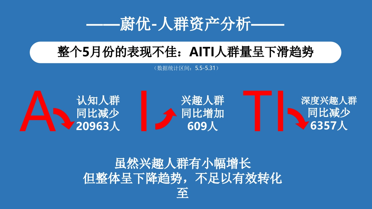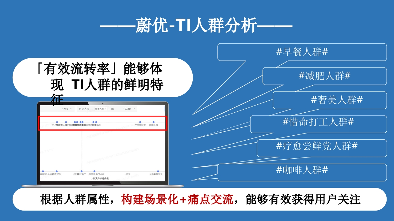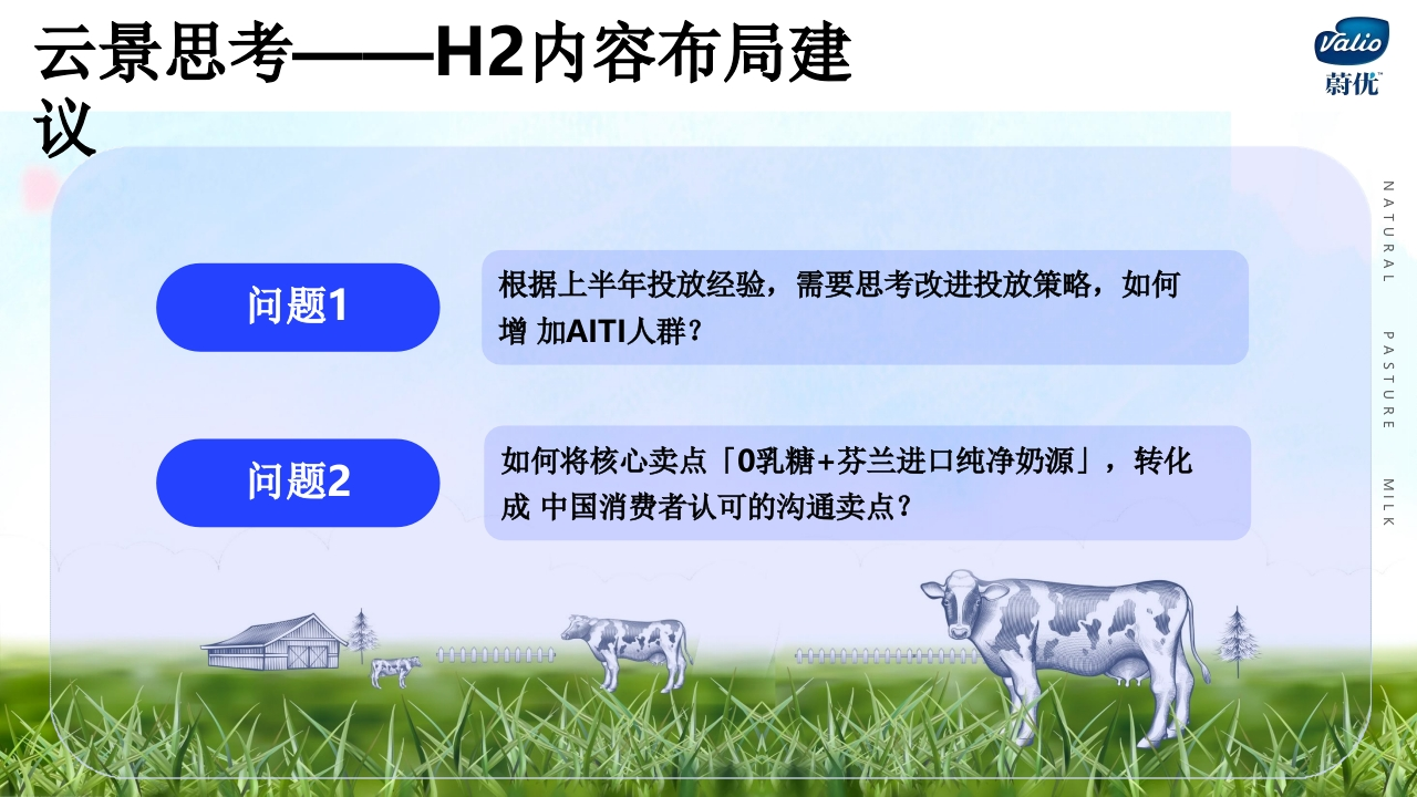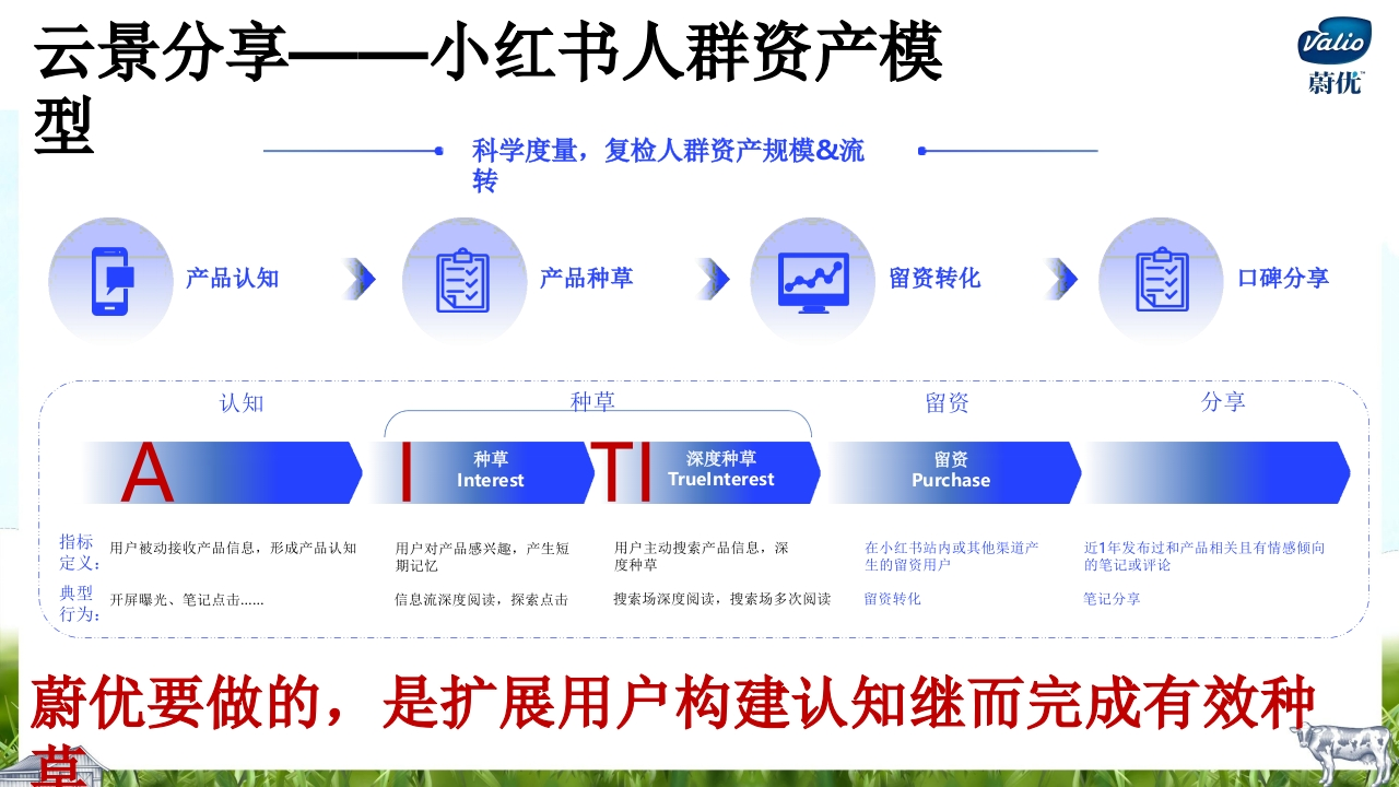 Valio蔚优NATURALNATURAL PASTURE MILK蔚优奶粉投PASTURE蔚优0乳糖高钙调制奶粉u纸H CLOM ML放MILK组的品百日片雨通粉门0HM路2"小红书AIT人群拓展与卖点优化种草方案410038线00时高蛋白质HIGH PROTEINA云景思考一H2内容布局建Valio蔚优议NATURAL问题1根据上半年投放经验,需要思考改进投放策略,如何增加AITI人群?PASTURE问题2如何将核心卖点「0乳糖+芬兰进口纯净奶源」,转化成中国消费者认可的沟通卖点?0000100001000-000010-1-1-00-0011云景分享一小红书人群资产模Valio蔚优型科学度量,复检人群资产规模&流转产品认知产品种草留资转化口碑分享认知种草留资分享种草深度种草留资InterestTruelnterestPurchase指标用户被动接收产品信息,形成产品认知用户对产品感兴趣,产生短用户主动搜索产品信息,深在小红书站内或其他渠道产近1年发布过和产品相关且有情感倾向定义:期记忆度种草生的留资用户的笔记或评论典型开屏曝光、笔记点击.信息流深度阅读,探索点击搜索场深度阅读,搜索场多次阅读留资转化笔记分享行为:蔚优要做的,是扩展用户构建认知继而完成有效种蔚优-人群资产分析整个5月份的表现不佳:AITI人群量呈下滑趋势(数据统计区间:5.5-5.31)认知人群兴趣人群深度兴趣人群同比减少同比增加同比减少20963人609人6357人虽然兴趣人群有小幅增长但整体呈下降趋势,不足以有效转化至云景洞蔡一小红书种草关键指标Valio蔚优解决度量痛点T人群如何定义行为小红书种草种草成功指标用户购买汽车行业T数据内测中决策路径关键指标AITI人数深度阅读…频次场域精准搜索…有效评论…有效私信.…Truelnterest品牌行业SPU属性情感内容结构化蔚优-TI人群分析#早餐人群#「有效流转率」能够体#减肥人群#现T人群的鲜明特征#奢美人群#1/10~目标人群奢美人肝×+1819/20●●●●●●R人际●#惜命打工人群##疗愈尝鲜党人群#9妈1,02市00后20m中产昆装i中0a0#咖啡人群#4,000人科资产渗透规模根据人群属性,构建场景化+痛点交流,能够有效获得用户关注