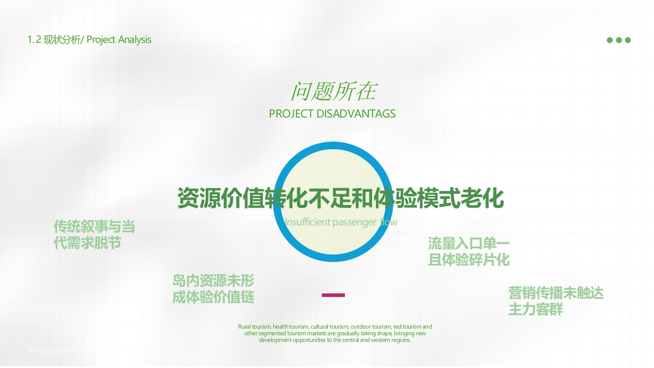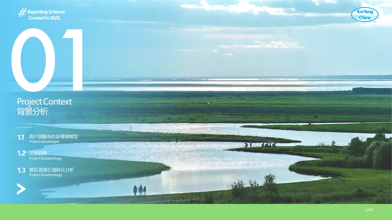 Reporting Schemefue怡ngCreated In 2025.ChinaJUNSHANISLAND君山岛景区年度营销规戌划方案NICE TO MEET YOU!DESIGN ABOUTJUNSHAN ISLANDTHERE IS NO HUSTLE AND BUSTLE OF THE CHY,ONLY A LEISURE AND QUIET本方案收供内部参考,不用作狂何商业途REPORTING SCHEMEReporting Schemeue怡ngCreated In 2025.China01Project Context背景分析1.1用户洞察&社会情绪模型Project Advantages1.2文旅趋势Project Disadvantage1.3景区资源价值转化分析Project Disadvantage幽2/401.1人群洞察&社会情绪模型/Project Analysis●●●四大维度八大情绪洞察时代情我与我与个人自我世界他人发展身心WORD CONNECTIONSWORD CONNECTIONSNORD CONNECTIONSNORD CONNECTIONS自然联结情感关系个人成长身体可持续文化联结社交互动个人成就心理可持续1.2文旅趋势/Project Analysis●●●旅游正在从"流量导向"向"价值沉淀"转变游客不再满足于走马观花的拍照附打卡而是倾向于深入历史语境参与地方活动理解城市文化的"慢旅行”模式10份钟慢人20分钟慢人一天慢人一周慢人一月慢人一年慢人并手冲咖啡#公园20分钟路亚#景德镇学陶艺井旅居#我的小院23年相关搜案同比增长近90天年相关搜素环比增长23年相关度素同比增长23年相关瘦素同比增长23年相关搜案同比增长23年相关搜率同增长23,42%457450%114%402.83%124.42%119.74%1.3现状分析/Project Analysis●●●资源类别现有开发现状转化不足点优化方向生态君山银针、湿地、候鸟体验浅层工艺感知弱非遗工坊体验、茶美学空间风光洞庭湖、岛内植被功能单一未与活动结合生态艺术装置、自然疗愈场景人文柳毅传书、娥皇女英、古代诗词叙事陈旧,互动性弱情感沉浸剧场、P剧情游戏Rural tourism,health tourism,altural tourism outdoor tourism red tourism andother segmented tourism markets are gradually taking shape,bringing newdevelopment opportunities to the central and western regions.1.2现状分析/Project Analysis●●0问题所在PROJECT DISADVANTAGS资源价值转化不足和休验模式老化传统叙事与当Insufficient passenger代需求脱节流量入口单且体验碎片化岛内资源未形成体验价值链营销传播未触达主力客群Rural tourism health tourism,cultural tourism outdoor tourism,red tourism andother segmented tourism markets are gradually taking shape bringing newdevelopment opportunities to the central and western regions.