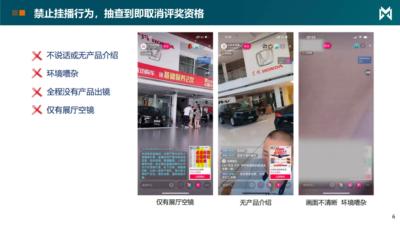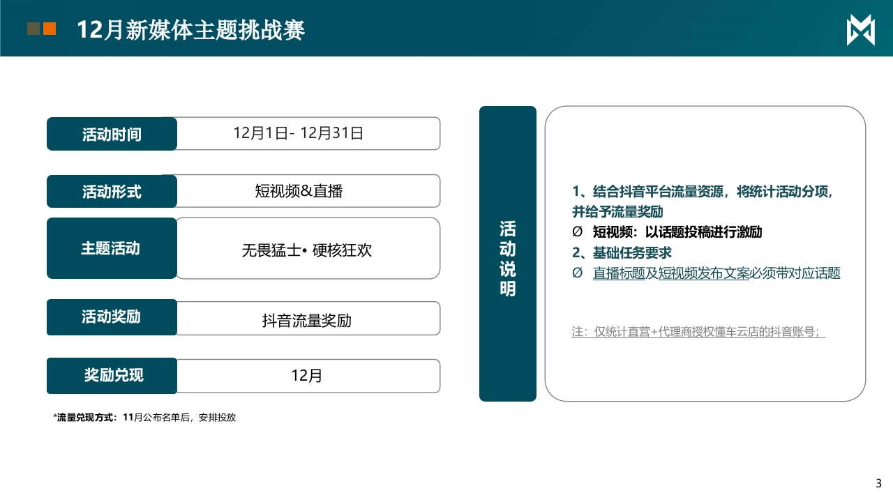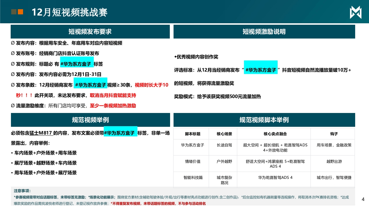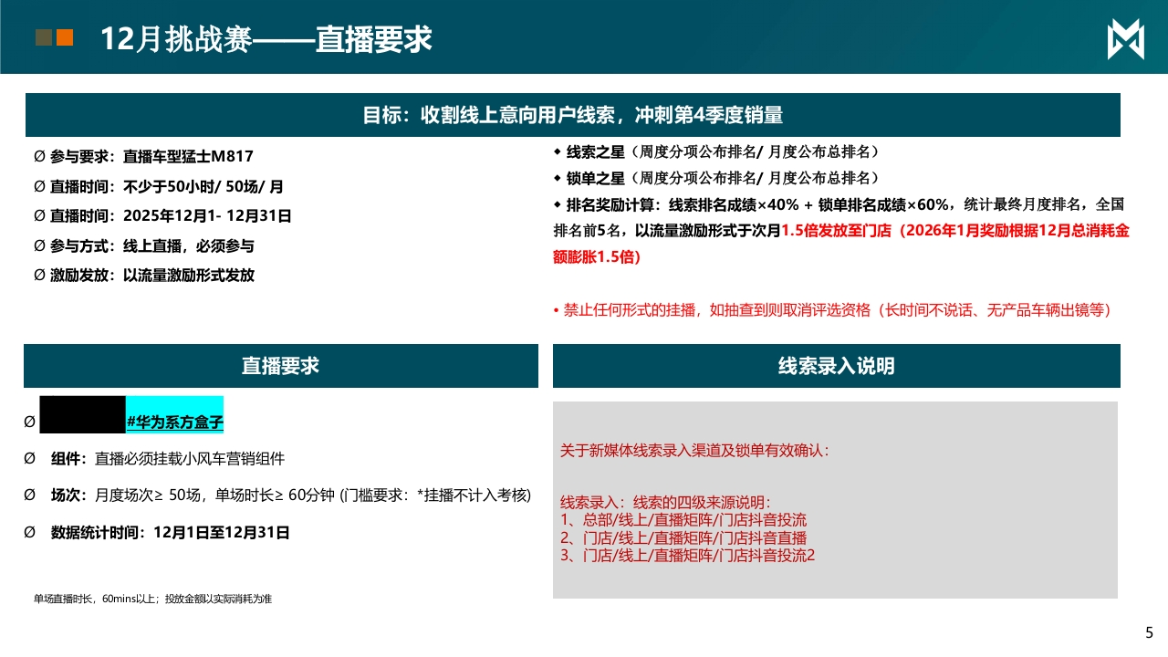 东风汽车DONGFENG MOTOR凶猛士东风猛士新媒体月度营销指引方案2025/12/1Agenda目录一、短视频活动、脚本二、直播活动、脚本12月新媒体主题挑战赛凶活动时间12月1日-12月31日活动形式短视频&直播1、结合抖音平台流量资源,将统计活动分项,并给予流量奖励⑦短视频:以话题投稿进行激励主题活动无畏猛士·硬核狂欢2、基础任务要求萌0直播标题及短视频发布文案必须带对应话题活动奖励抖音流量奖励注:仅统计直营+代理商授权懂车云店的抖音账号:奖励兑现12月*流量兑现方式:11月公布名单后,安排投放312月短视频挑战赛凶短视频发布要求短视频激励说明☑发布内容:根据用车安全、年底用车对应内容短视频0发布账号:经销商门店抖音认证账号发布◆优秀视频内容创作奖⑦发布规则:标题必有#华为系方盒子标签评选标准:从12月当经销商发布#华为系方盒子”抖音短视频自然流播放量破10万+0发布内容:发布内容必需为12月1日-31日0发布条数:12月经销商发布#华为系方盒子视频≥30条,视频时长大于10的短视频,将获得流量激励奖秒!!!此开关项,未达发布要求,取消当月抖音赋能支持奖励模式:给予该获奖视频500元流量加热⑦流量激励维度:所有门店均可享受,至少一条视频加热激励规范视频举例规范视频脚本举例必须包含猛士M817的内容,发布文案必须带#华为系方盒子标签,非单一场脚本标题核心场景核心卖点融合钩子景露出,内容举例:华为系方盒子长途自驾超大空间+超长续航+乾崑智驾ADS用车场景,金融政策·车内场景+户外场景+用车场景4+外放电功能·展厅场景+越野场景+车内场景情绪价值户外越野舒适大空间+鸿蒙座舱5+乾崑智驾越野出游ADS 4·用车场景+户外场景+展厅场景智能科技篇城市复杂华为乾崑智驾ADS4城市出行,智驾便捷路况注意事项:*参赛视频需带对应话题标签,未带标签无激励:场景化功能展示;围绕官方素材含辅助驾驶体验/外观/出行等素材亮点功能进行创作,含二创作品):*后台监控如有机器刷量等违规操作,将取消本次PK赛排名资格:*达成爆款奖励的作品需找凌悦老师进行登记,未登记视作放弃参赛:*不得重复发布视频,未带话题标签的视频,不与参与活动排名12月挑战赛直播要求凶目标:收割线上意向用户线索,冲刺第4季度销量0参与要求:直播车型猛士M817·线索之星(周度分项公布排名/月度公布总排名)0直播时间:不少于50小时/50场/月·锁单之星(周度分项公布排名/月度公布总排名)·排名奖励计算:线索排名成绩×40%+锁单排名成绩×60%,统计最终月度排名,全国0直播时间:2025年12月1-12月31日排名前5名,以流量激励形式于次月1.5倍发放至门店(2026年1月奖励根据12月总消耗金0参与方式:线上直播,必须参与额膨胀1.5倍)☑激励发放:以流量激励形式发放·禁止任何形式的挂播,如抽查到则取消评选资格(长时间不说话、无产品车辆出镜等)直播要求线索录入说明0#华为系方盒子组件:直播必须挂载小风车营销组件关于新媒体线索录入渠道及锁单有效确认:0场次:月度场次≥50场,单场时长≥60分钟(门槛要求:*挂播不计入考核刻线索录入:线索的四级来源说明1、总部/线上直播矩阵/门店抖音投流0数据统计时间:12月1日至12月31日2、门店/线上直播矩阵/门店抖音直播3、门店/线上直播矩阵/门店抖音投流2单场直播时长,60mins以上;投放金额以实际消耗为准5禁止挂播行为,抽查到即取消评奖资格凶5G11415020:53令■@系风+是关注合方。2关注⊙0×X不说话或无产品介绍色小时情击小时榜义环境嘈杂功购车送基础保养2次点东佩HONDA白都非换X全程没有产品出镜X仅有展厅空镜大王我山2023来◆s可芳:急闲的欢迎来到直间抖严帮未减年击国直或打。播间内严帮出现过◆5阿芳:是孩子喜欢看你机、色情、相西、人身色在象皇乌CRV专场买车,用车有说落的朋友进判断,以防人身时产损失。请大家来期一期!意财产安全,理性。防网储该点赞得点筒,支特你门工作期说点什么⊙∽U说什么。仅有展厅空镜无产品介绍画面不清晰环境嘈杂6