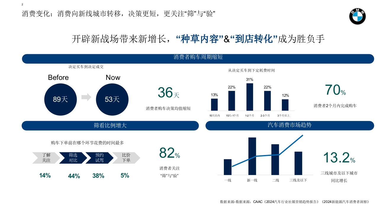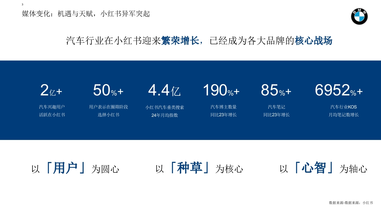 2025年宝马汽车小红书DGC内容加热方案2消费变化:消费向新线城市转移,决策更短,更关注“筛”与“验”开辟新战场带来新增长,“种草内容”&“到店转化”成为胜负手消费者购车周期缩短决定买车到决定成交从决定买车到下定耗费时间BeforeNow31%22%22%36天13%70%12%89天53天消费者2个月内完成购车消费者购车决策均值缩短5天以内15天-1个月12个月2-3个月3个月以上筛看比例增大汽车消费市场趋势购车下单前在哪个环节花费的时间最多了解筛选预约比价82%关注对比试驾下单M13.2%消费者关注14%44%38%5%“筛”与验”三线城市及以下城市新一线二线三线及以下同比增长数据来源-数据来源:CAAC《2024汽车行业社媒营销趋势报告》《2024新能源汽车消费者洞察》媒体变化:机遇与天赋,小红书异军突起汽车行业在小红书迎来繁荣增长,已经成为各大品牌的核心战场2z+50%+4.4亿190%+85%+6952%+汽车兴趣用户用户表示在圈筛阶段小红书汽车垂类搜索汽车博主数量汽车笔记汽车行业KOS活跃在小红书选择小红书24年月均指数同比23年增长同比23年增长月均笔记数增长以「用户」为圆心以「种草」为核心以「心智」为轴心数据来源-数据来源:小红书趋势变化:种草打法逐渐进阶M在平台通过精准的“用户-产品-需求”匹配,创造高效种草价值种草3.0种草1.0精准渗透种草2.0自然内容分发①以人群渗透为目标的反漏斗破圈投放打法-KFS策略,让单品高确定性地增长:KOL/KOC/KOS/UGC等反漏斗的内容策略,从用户社区流量的自然分发②洞察一方数据,深度探索用户偏需求出发产出优质内容,结好恰投放,建立心智卡位高效破圈爆文率、回搜率过程度量:人群资产,种草人群占比,核心人群渗透结果度量(需要一方数据):种草对生意贡献、全域归因、决策分析CTR、CPE5Trend Thinking...如此大势下,我们的现状是?西自我诊断整体现状、关键因素及竞品比对分析以重庆地区为例