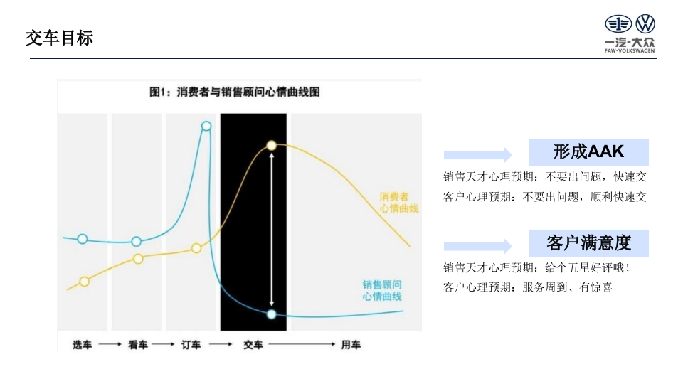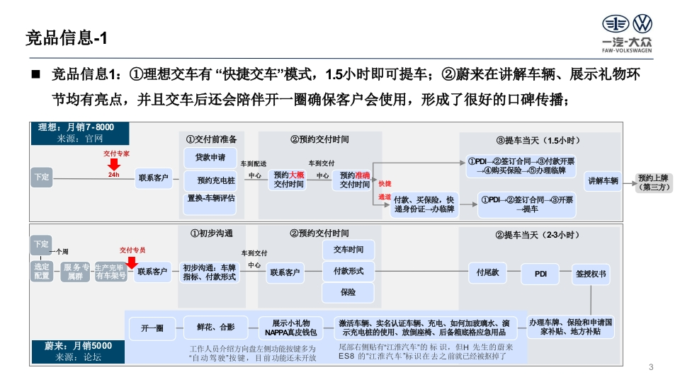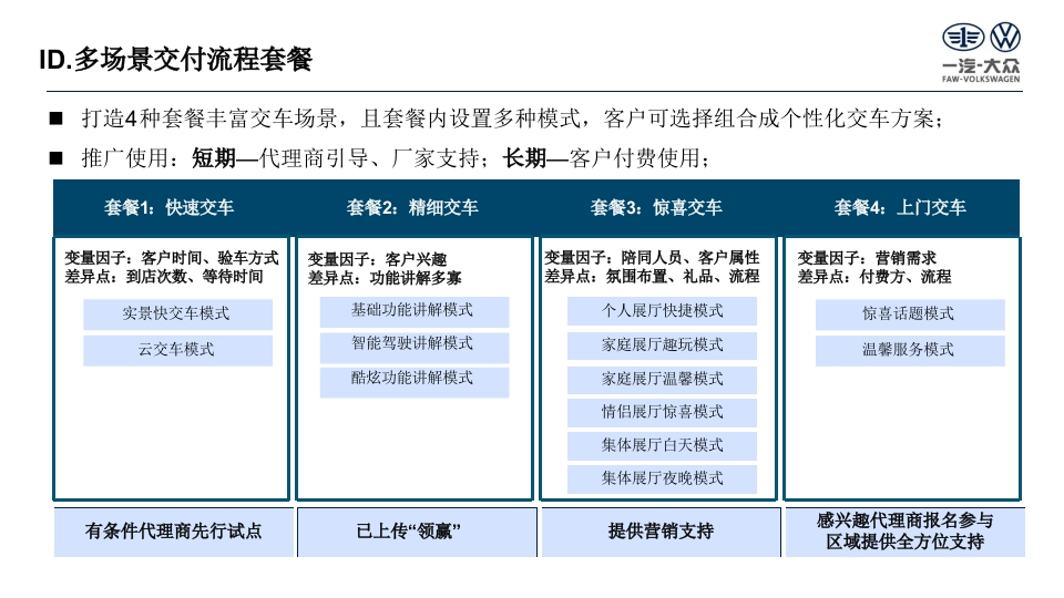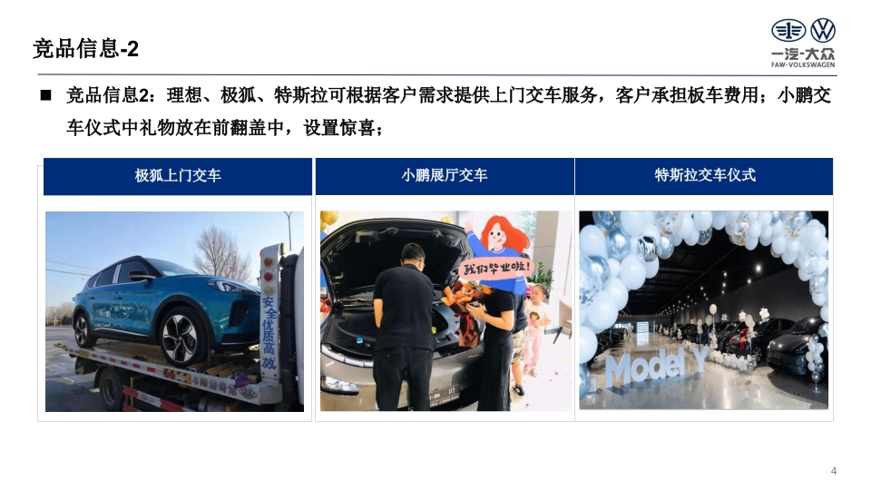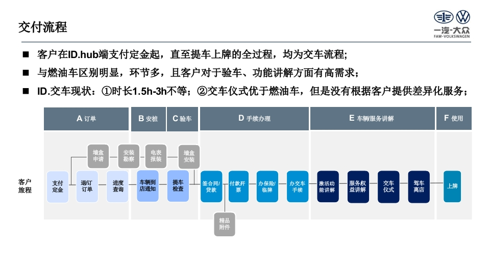 重及D四一提大尔凌车有眼公昌可gFAW-VOLKSWAGEN AUTOMCSIVE CO.LTTUTC后ETD一汽大众新能源交车仪式指导方案部门Division大众品牌版本号Version11更新日期Date2025-06-13国四交车目标一汽大众FAW-VOLKSWAGEN图1:消费者与销售顾问心情曲线图形成AAK销售天才心理预期:不要出问题,快速交消费者客户心理预期:不要出问题,顺利快速交心情曲线客户满意度销售天才心理预期:给个五星好评哦!销售顾问客户心理预期:服务周到、有惊喜心情曲线选车→看车→订车→+交车用车国四交付流程一汽大众FAW-VOLKSWAGEN■客户在ID.hub端支付定金起,直至提车上牌的全过程,均为交车流程:■与燃油车区别明显,环节多,且客户对于验车、功能讲解方面有高需求;ID.交车现状:①时长1.5h-3h不等;②交车仪式优于燃油车,但是没有根据客户提供差异化服务;A订单B安柱C验车D手续办理E车辆服务讲解F使用墙盒安装电表墙盒申请物察报装安装客户支付退/订进度车辆到提签合同/付数开办保险办交车激活功服务权交车驾车旅定金订单查询店通知检查贷款临牌手续能讲解益讲解仪式离店上牌精品附件国四竞品信息1一汽大众FAW-VOLKSWAGEN◆竞品信息1:①理想交车有“快捷交车模式,1.5小时即可提车;②蔚来在讲解车辆、展示礼物环节均有亮点,并且交车后还会陪伴开一圈确保客户会使用,形成了很好的口碑传播;理想:月销7-8000来源:官网①交付前准备②预约交付时间③提车当天(1.5小时)交付专家贷款申请车到配送车到交付①PDl②签订合同-③付款开票④购买保险⑤办理临牌下定24h联系客户中心预约大概中心预约准确预约充电桩交付时间交付时间快捷讲解车辆预约上牌(第三方)置换车辆评估通道付数、买保险,快①PDL,②签订合同-③开票递身份证→办临牌提车①初步沟通②预约交付时间②提车当天(23小时)下定一个周交付专员车到交付交车时间定服务专生产完联系客户初步沟通:车牌中心配置付款形式属群有车架号指标、付款形式联系客户付尾款PDI签授权书保险开一圈鲜花、合影展示小礼物激活车辆、实名认证车辆、充电、如何加玻璃水、演办理车牌、保险和申请国NAPPA真皮钱包示充电桩的使用、放倒座椅、后备箱底格应总用品家补贴、地方补贴蔚来:月销5000工作人员介绍方向盘左侧功能按键多为尾部右侧贴有江淮汽车"的标识,但H先生的蔚来来源:论坛“自动驾驶"按键,目前功能还未开放ES8的"江淮汽车"标识在去之前就己经被抠掉了3国四竞品信息2一汽大众FAW-VOLKSWAGEN■竞品信息2:理想、极狐、特斯拉可根据客户需求提供上门交车服务,客户承担板车费用;小鹏交车仪式中礼物放在前翻盖中,设置惊喜;极狐上门交车小鹏展厅交车特斯拉交车仪式我的竿业啦!安全优质高效4国四ID.多场景交付流程套餐一汽大众FAW-VOLKSWAGEN打造4种套餐丰富交车场景,且套餐内设置多种模式,客户可选择组合成个性化交车方案;推广使用:短期一代理商引导、厂家支持;长期一客户付费使用:套餐1:快速交车套餐2:精细交车套餐3:惊喜交车套餐4:上门交车变量因子:客户时间、验车方式变量因子:客户兴趣变量因子:陪同人员、客户属性变量因子:营销需求差异点:到店次数、等待时间差异点:功能讲解多寡差异点:氛围布置、礼品、流程差异点:付费方、流程实景快交车模式基础功能讲解模式个人展厅快捷模式惊喜话题模式云交车模式智能驾驶讲解模式家庭展厅趣玩模式温馨服务模式酷炫功能讲解模式家庭展厅温馨模式情侣展厅惊喜模式集体展厅白天模式集体展厅夜晚模式有条件代理商先行试点已上传“领赢”提供营销支持感兴趣代理商报名参与区域提供全方位支持