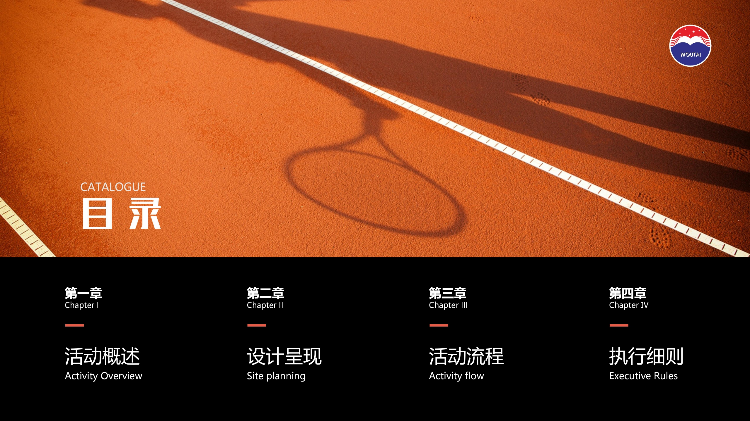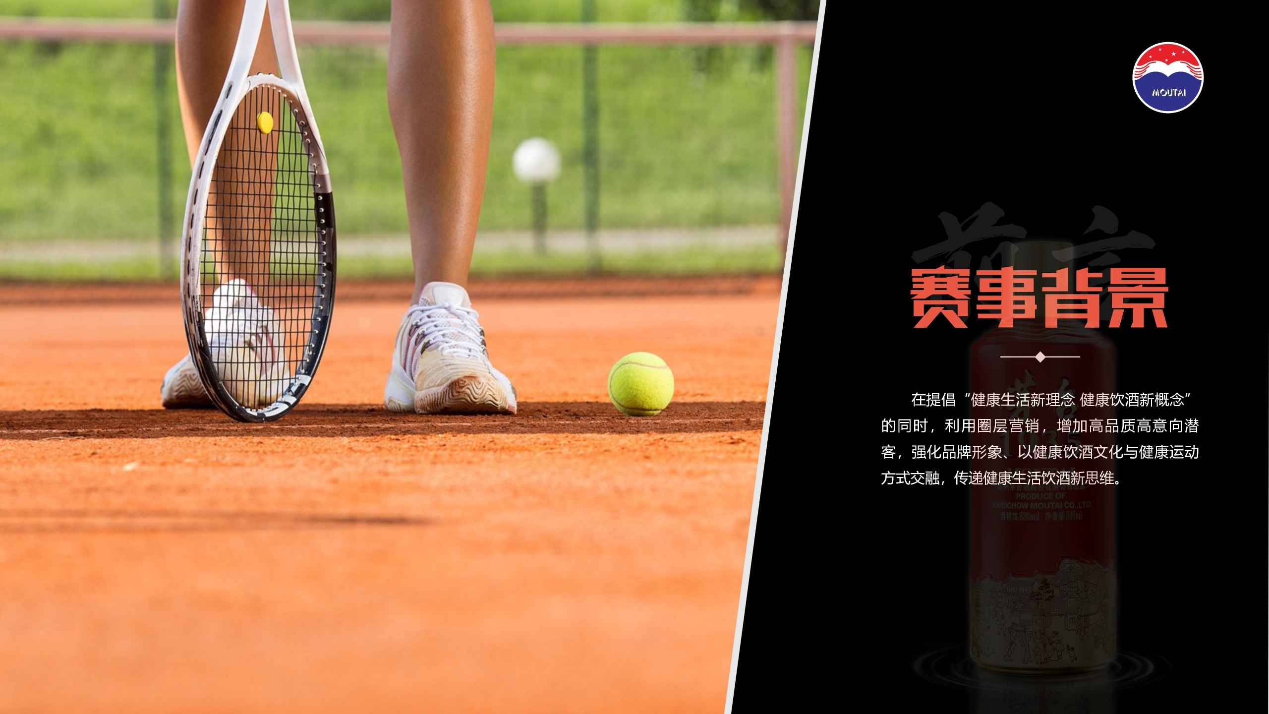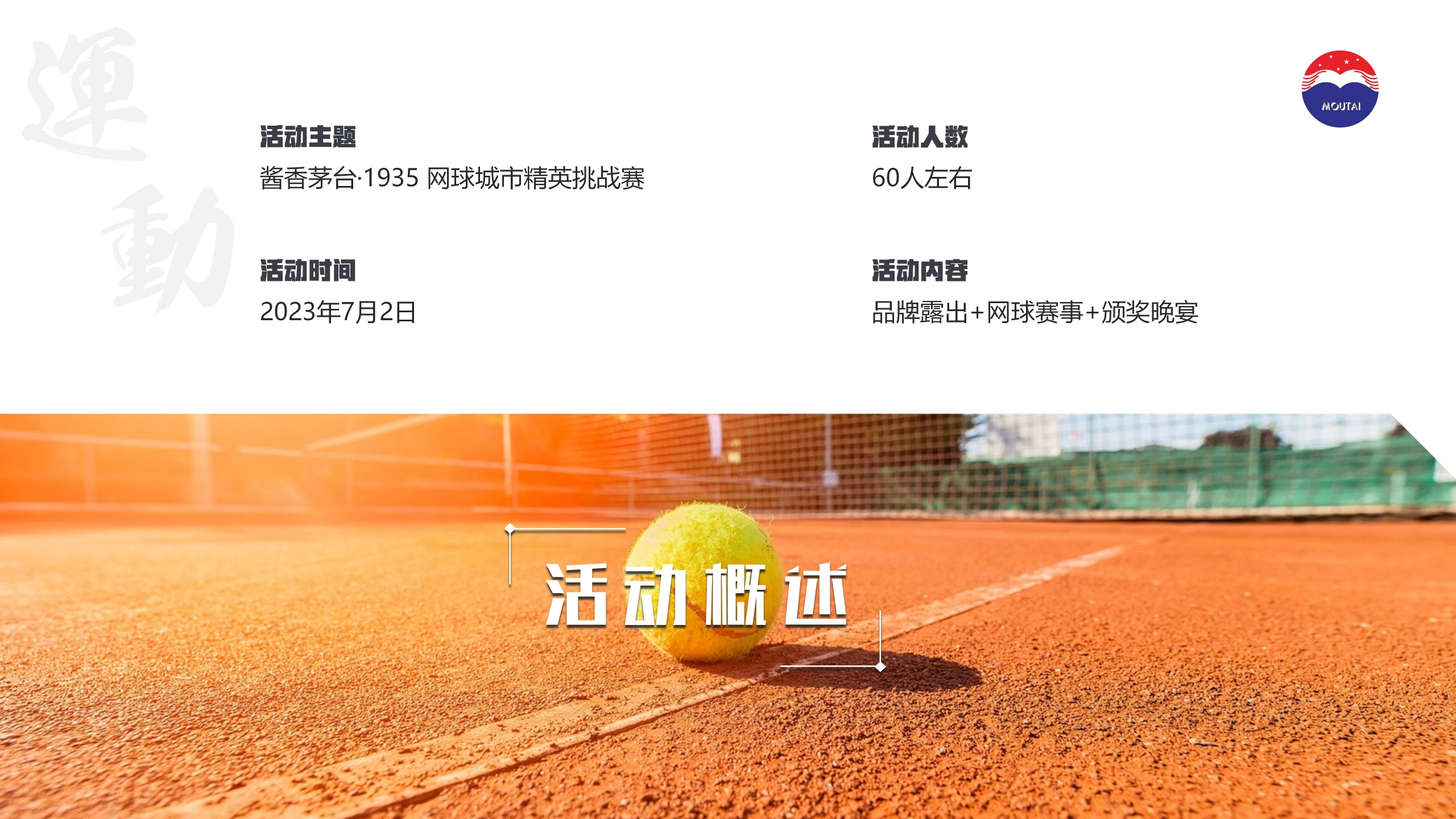 2023酱香茅台•1935网球城市精英挑战赛Sauce Flavored Maotai.1935 Tennis City Elite Challenge茅名策划方案19358MOUTAIKWEICHOW MOUTAI CO.,LTD.酒精度53%w0l净含量500mlMOUTA赛事背系◆一在提倡“健康生活新理念健康饮酒新概念”的同时,利用圈层营销,增加高品质高意向潜客,强化品牌形象、以健康饮酒文化与健康运动方式交融,传递健康生活饮酒新思维应净含量500MOUTACATALOGUE目录第一章第二章第三章第四章Chapter IChapter IIChapter IllChapter IV活动概述设计呈现活动流程执行细则Activity OverviewSite planningActivity flowExecutive RulesMOUTA01活动概述Activity OverviewMOUTA以球会友以酒汉情MEETING FRIENDS TO EXPRESS FEELINGS茅台1395通过与网球精英赛融合来回馈“网球界茅粉”对茅台酱香系列酒的热爱。让这一全民运动与“茅台酱香,万家共享“的理念融合,让体育活动走进千家万户,让茅台酱香走进千家万户。193喜相逢茅名1935活动主题活动人数酱香茅台1935网球城市精英挑战赛60人左右活动时间活动内容2023年7月2日品牌露出+网球赛事+颁奖晚宴活动概迹